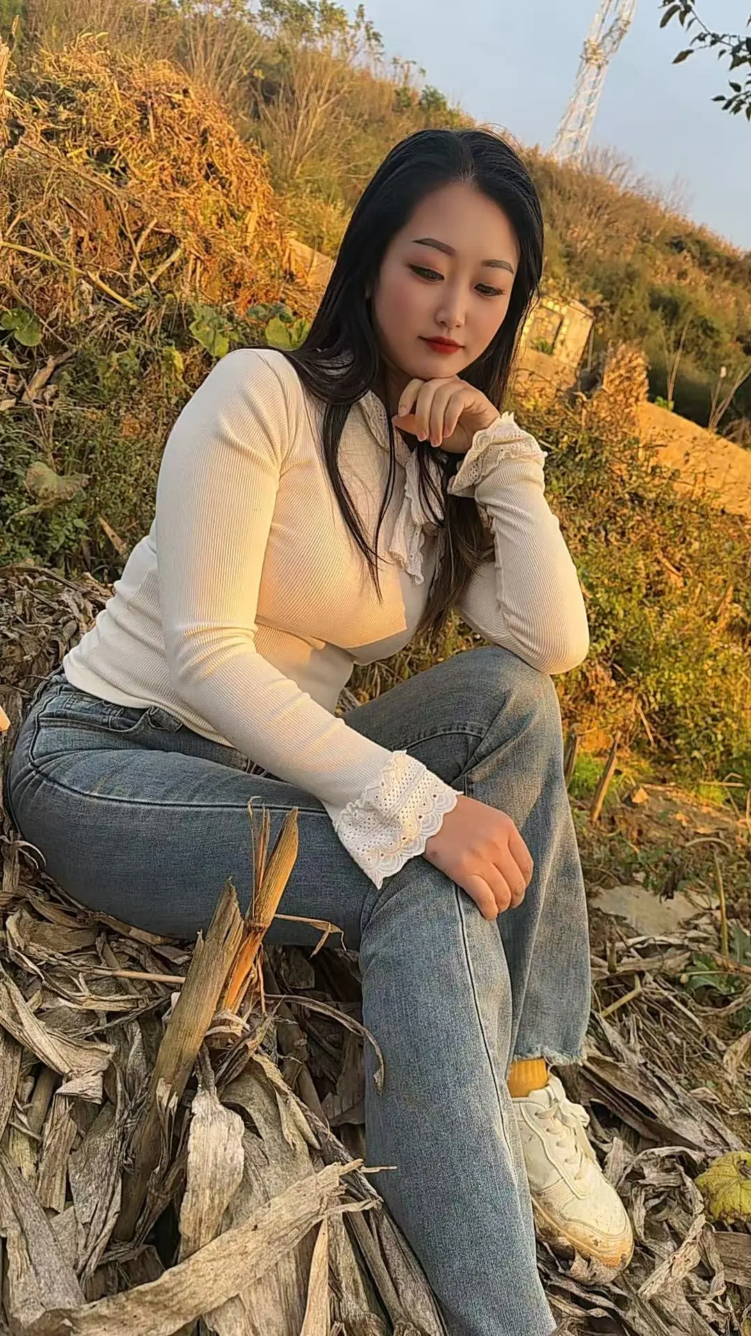 阳光下的甜美笑容,白色衬衫与牛仔裤的完美搭配,尽显自然与优雅。