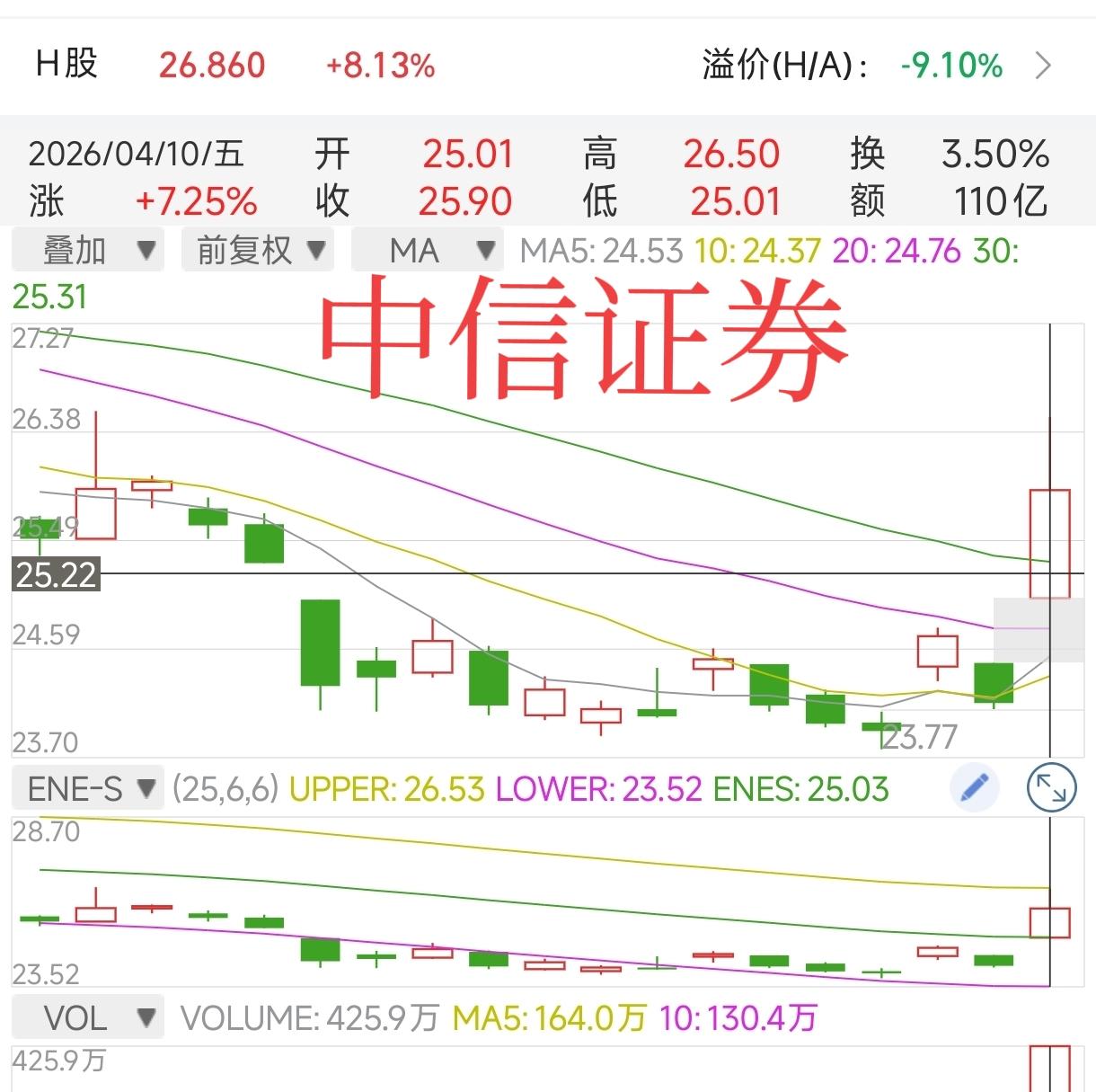 中信证券今日收盘价25.90元,上涨1.75元,涨幅7.25%,一举收复3月20日以来的跌幅,市值来到3839亿元。