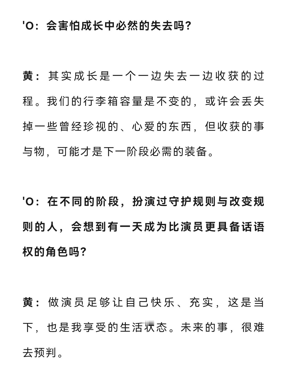 黄景瑜︱《时装LOFFICIEL》︱采访文字节选2026年四月封面故事,关于自己的成长:①关于未来:或许我真的不是一个擅长去做‘规划’的人,做好当下的事,比去设想遥远的地方更现实②关于剧本:即便有不同的机会,也要考量自己从内心出发的接受程度,剧本和角色如果是自己不喜欢的,不如就暂时待在熟悉和喜欢的领域里深造,等待下一次机会到来③关于自由:自由是未竟的底色,自律让我自由,保持最佳状态,随时迎接无限可能的角色,需要的时候也可以向“少年”返航④十年成长:人生是一个起点跑向另一个起点,成长也并不能用时间单位去衡量。“不念过往,不畏将来”,成长是一个一边失去一边收获的过程