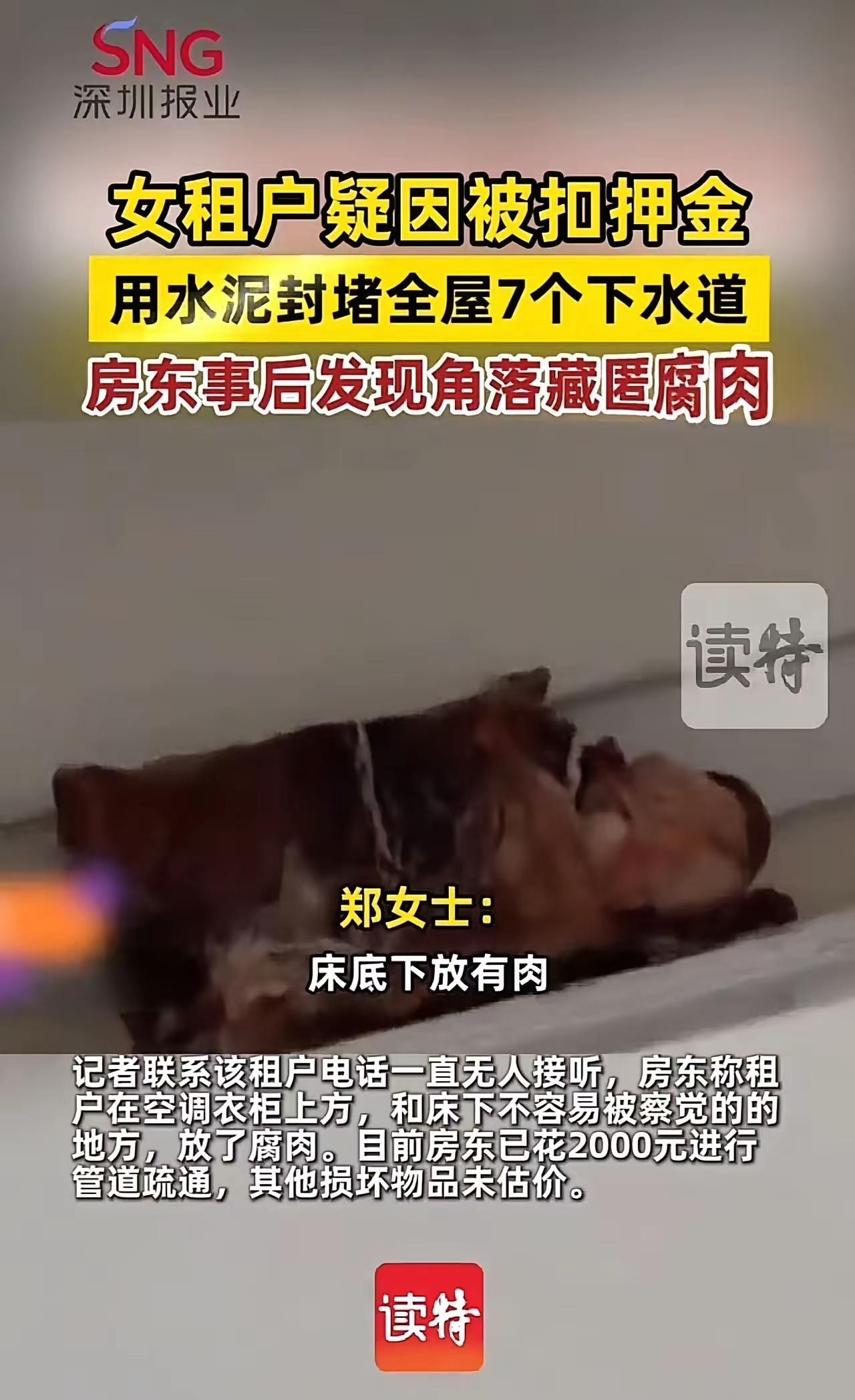 当郑女士准备进行房屋检查时,她惊呆了:全屋的7个下水道竟然被水泥封堵,连平时最不显眼的角落里都散发着阵阵恶臭——那是腐肉腐烂的味道。她几乎无法相信,居然有租客会做出如此极端的“报复”行为。面对这样的场景,郑女士既气愤又无奈:“一个女孩子怎么能这么缺德,太没有素质了!”