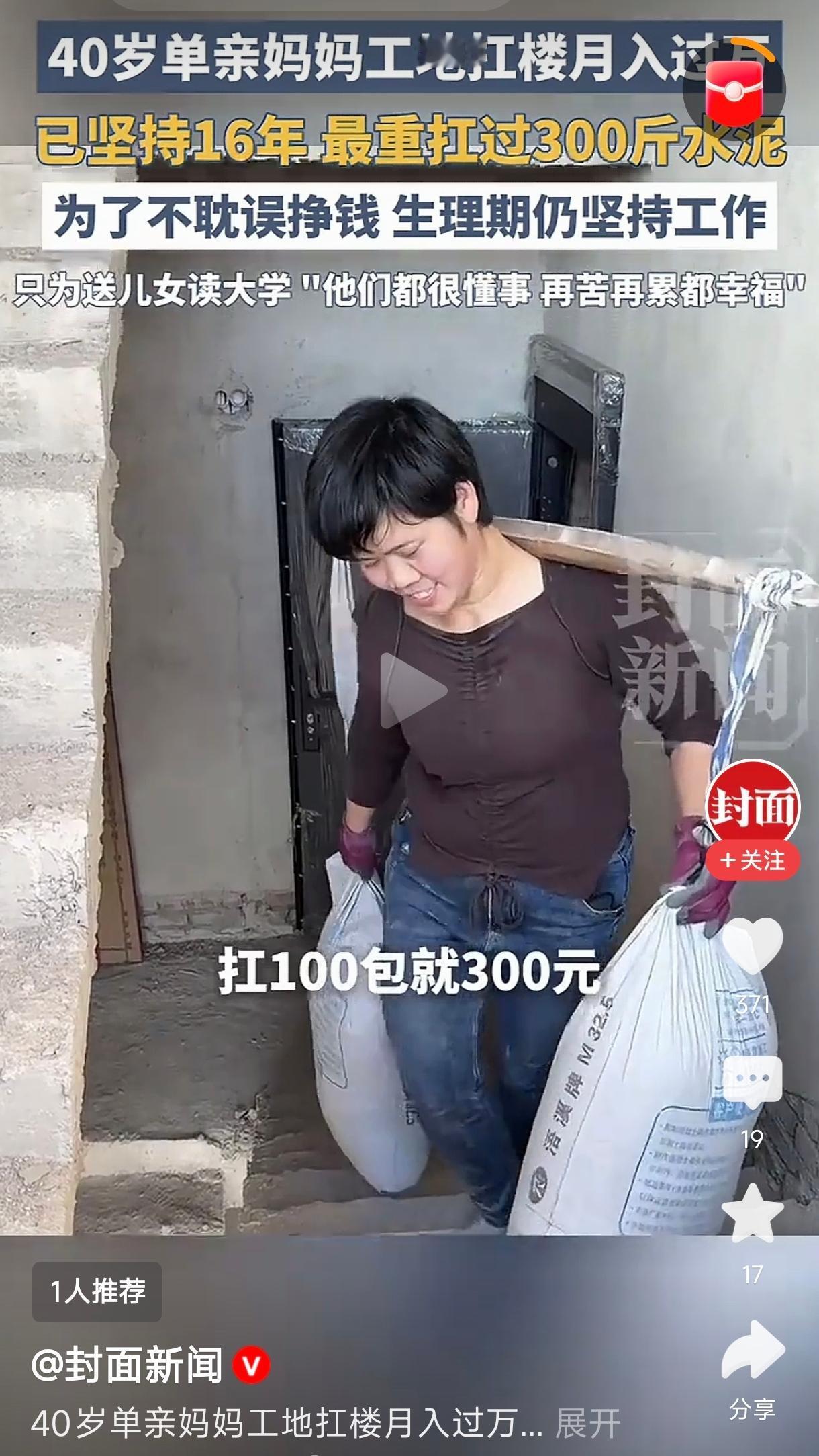 魏云桂的故事非常感人,她用坚韧和勤劳撑起了家庭,展现了单亲妈妈的伟大力量。每天扛着沉重的水泥袋,顶着生理期的疼痛,她依然坚持不懈,只为了给孩子创造更好的未来。她的付出和坚持,体现了母爱的无私和伟大,也激励着许多人面对困难时不轻言放弃。希望她的孩子们能够顺利完成学业,实现梦想,也希望社会能给予像魏云桂这样坚强的劳动者更多的关爱和支持。坚强励志妈妈