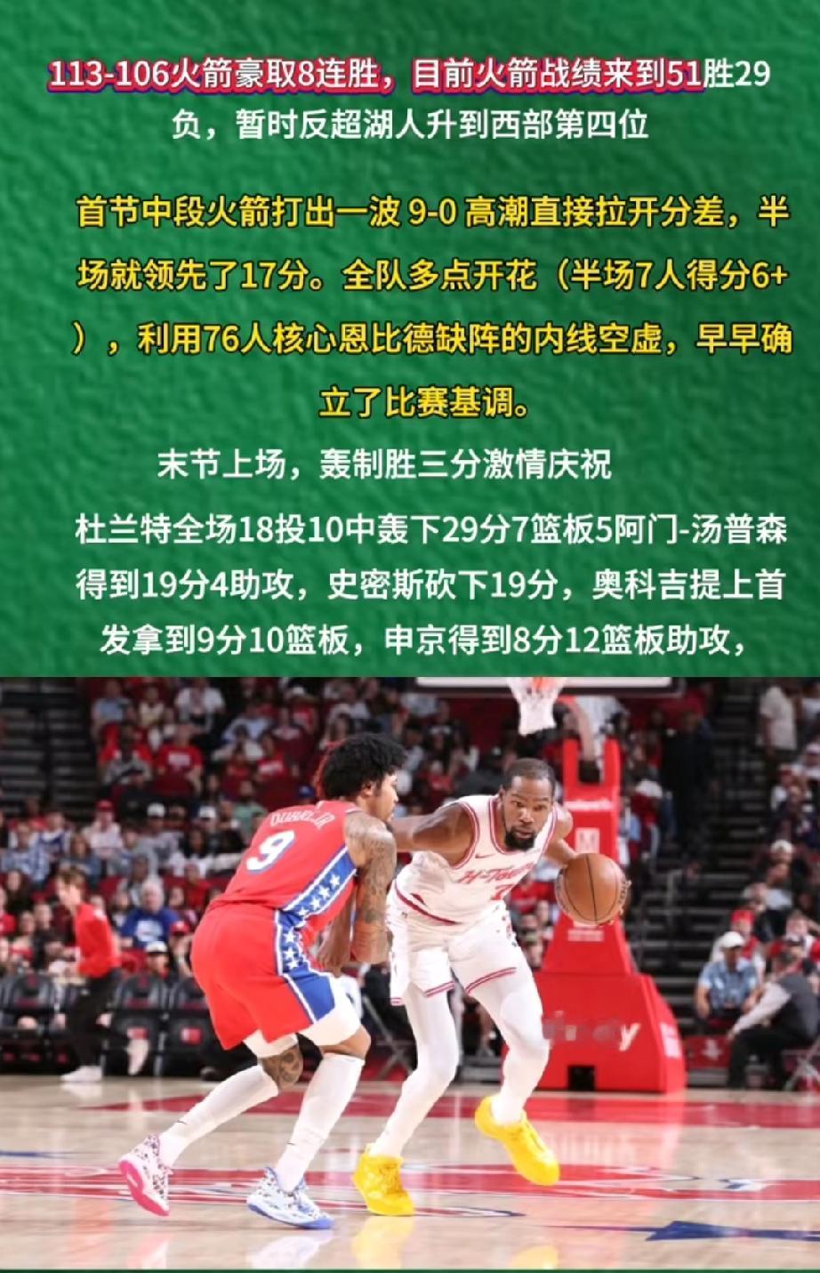 一场113-102让湖人无奈!火箭夺得主场优势,西部前6排名基本确定。