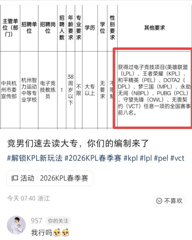 学历对竞人最有用的一集!近日,一则招聘“杭州中宣委招聘电子竞技教练员岗位”的帖子