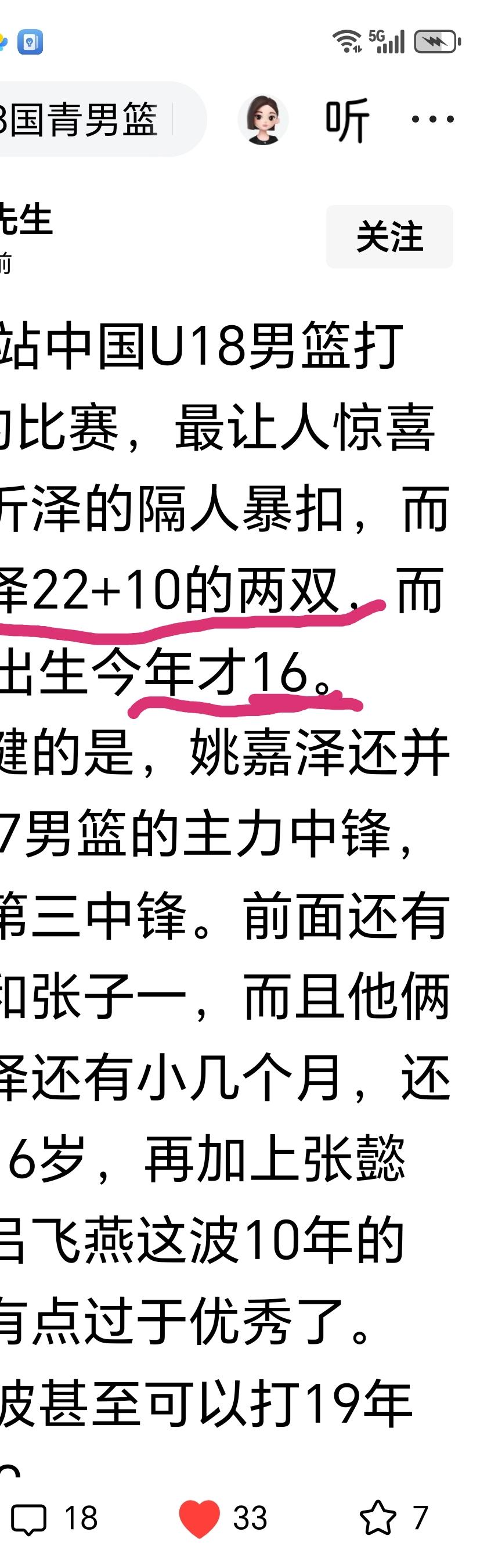 今天刷到16岁的姚嘉泽代表U18参赛,与澳大利亚的比赛中22十10的好数据,这样的球员不就是广东宏远俱乐部的希望吗?