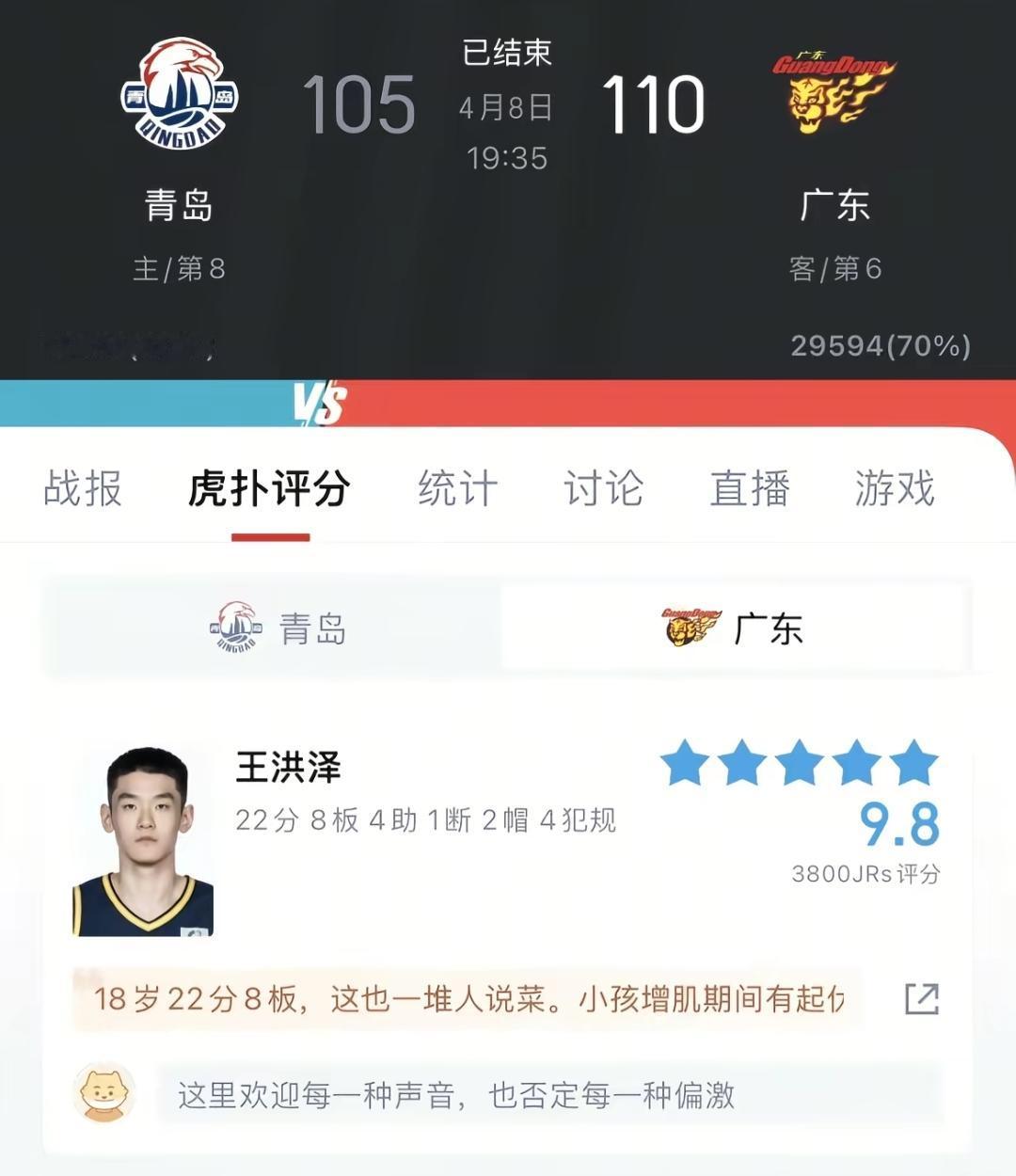 五、王洪泽前两天与青岛比赛中22+得分8板。