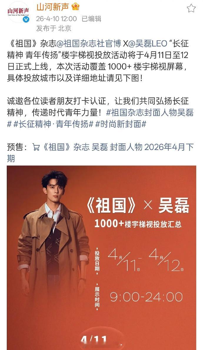 《祖国》杂志给吴磊投放了1000+地广,这排面史无前例,夯到爆!不愧是顶级含金量的正刊,格局直接拉满。吴磊这波属实排面天花板!🔥