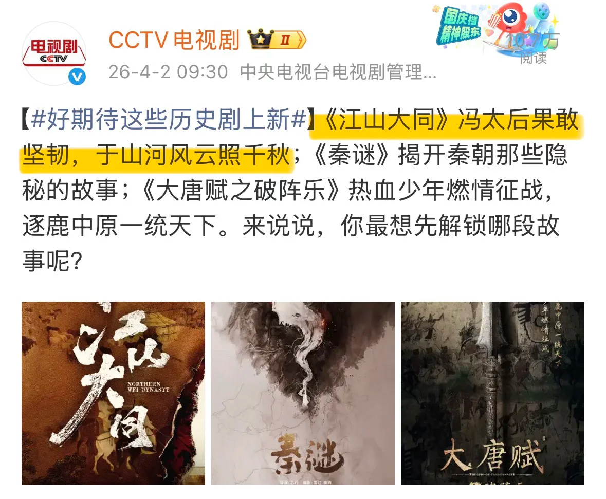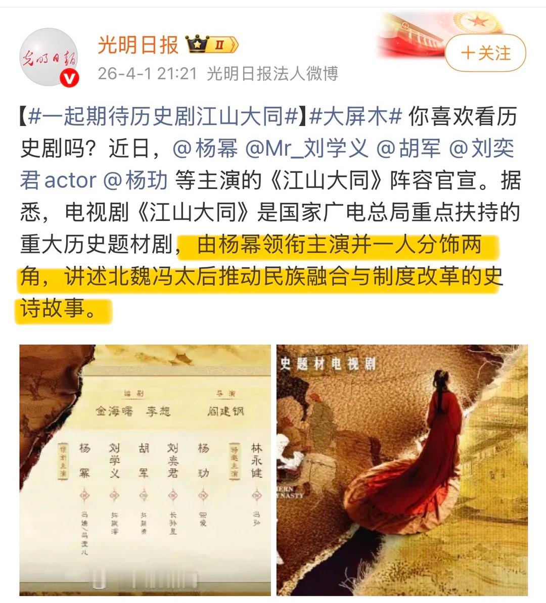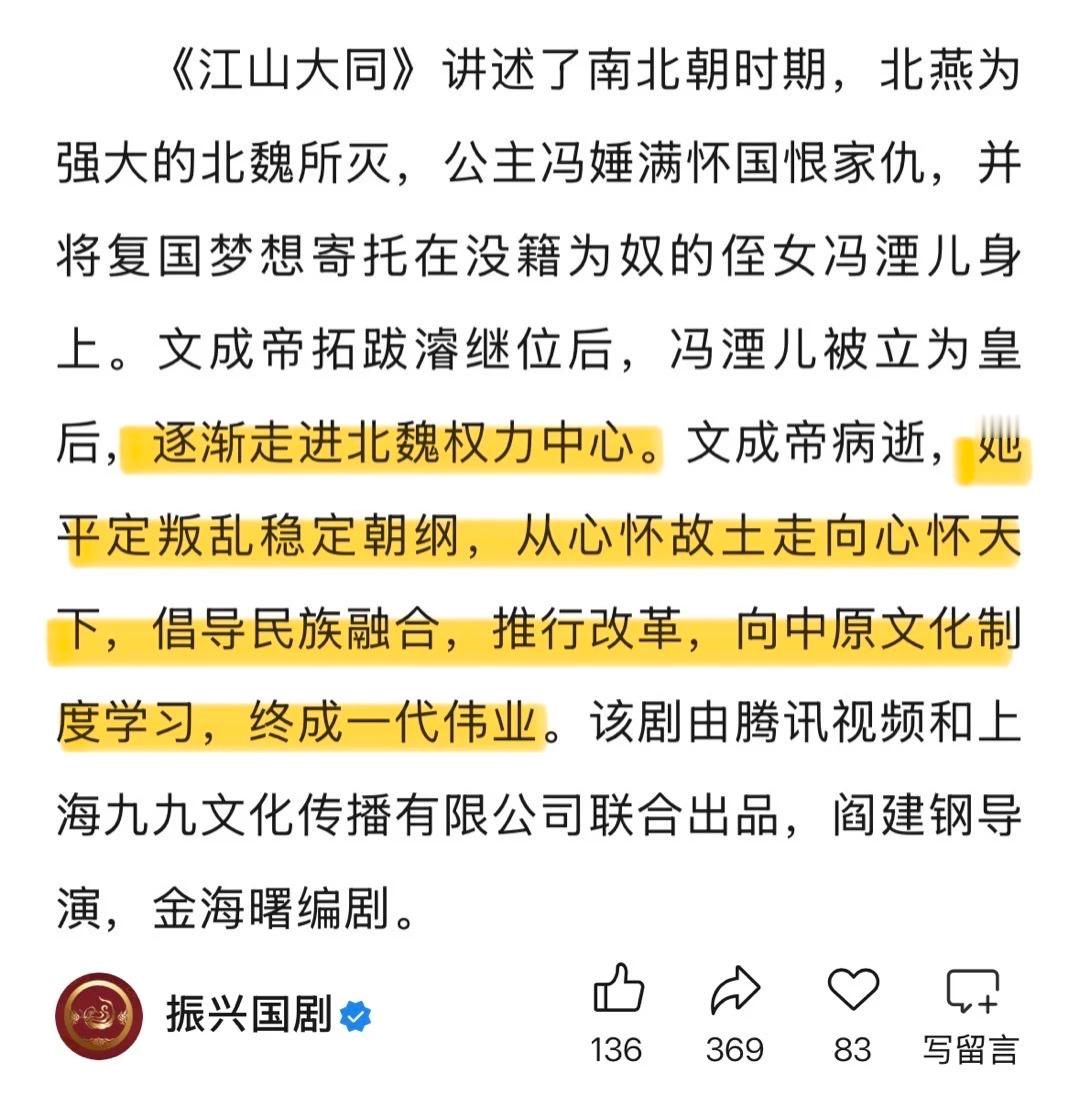 山西省广播电视局:《江山大同》直接弱化了情感线,重点聚焦冯太后的政治功绩光明日报:北魏冯太后推动民族融合与制度改革的史诗故事CCTV电视剧:冯太后果敢坚韧,于山河风云照千秋振兴国剧:冯湮儿平定叛乱稳定朝纲,从心怀故土走向心怀天下,倡导民族融合,推行改革,向中原文化制度学习,终成一代伟业。