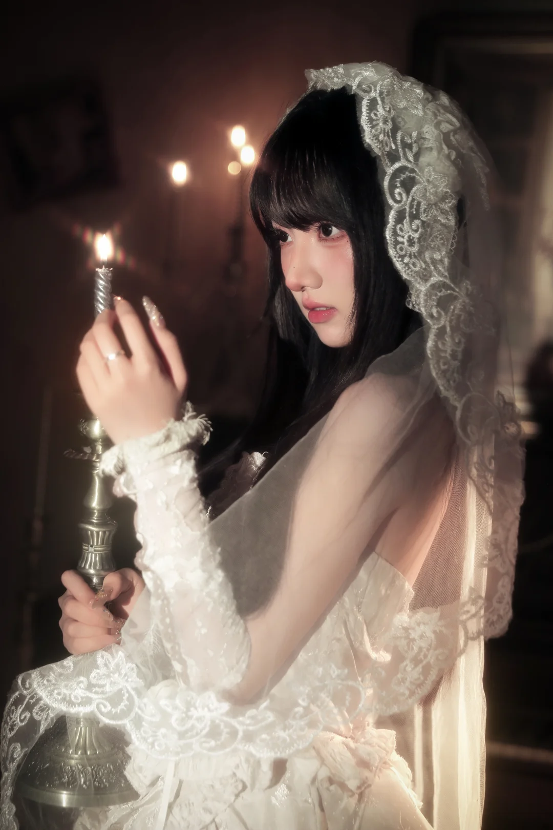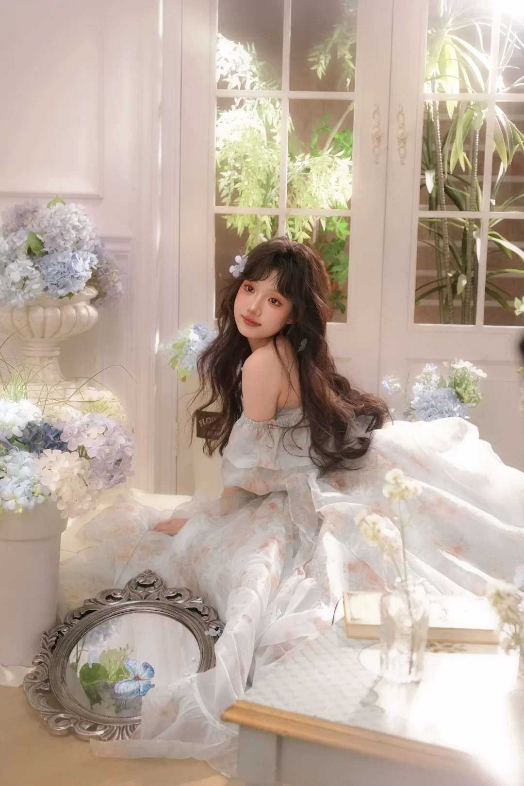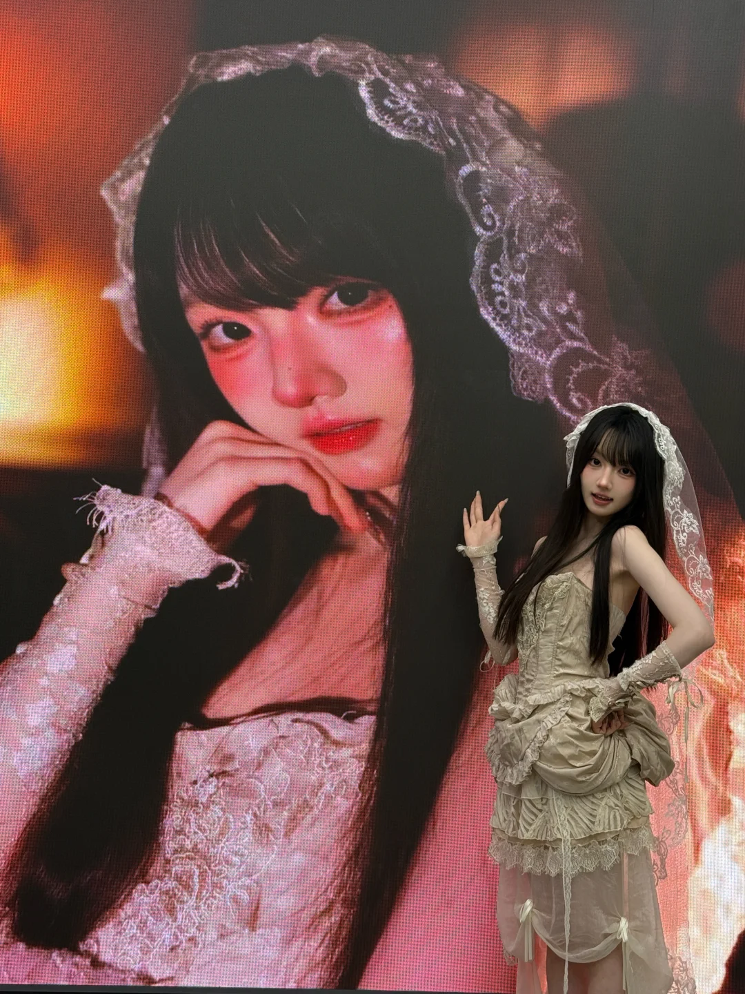妆容特别精致,服装是doll感重工花苞裙,特别好看!场景搭配我也好喜欢^^