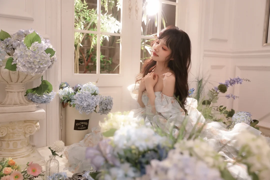 满屋子的鲜花置景氛围感拉满,阳光透过缝隙洒下来,特别浪漫