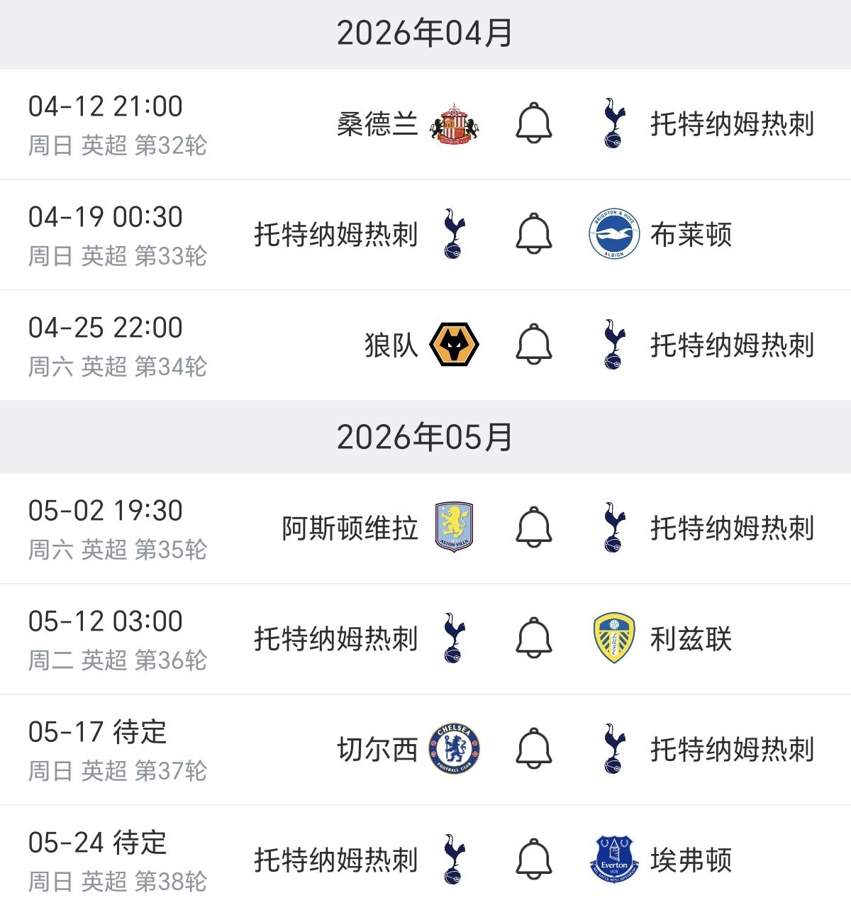 球队四月赛程难度相对温和,期间将先后对阵桑德兰与布莱顿两支队伍,两队当前在积分榜上处境平稳,不会出现“战意超强”的情况。此外热刺还将在4月26日迎战狼队,届时狼队大概率已确定降级,同样是热刺拿下积分的大好机会。