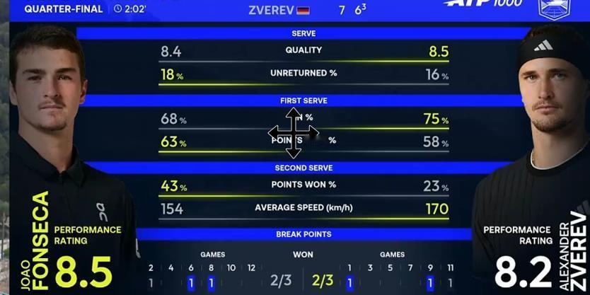 蒙特卡洛大师赛,首场1/4决赛 丰塞卡5-7,6(3)-7兹维列夫 双方1-1战