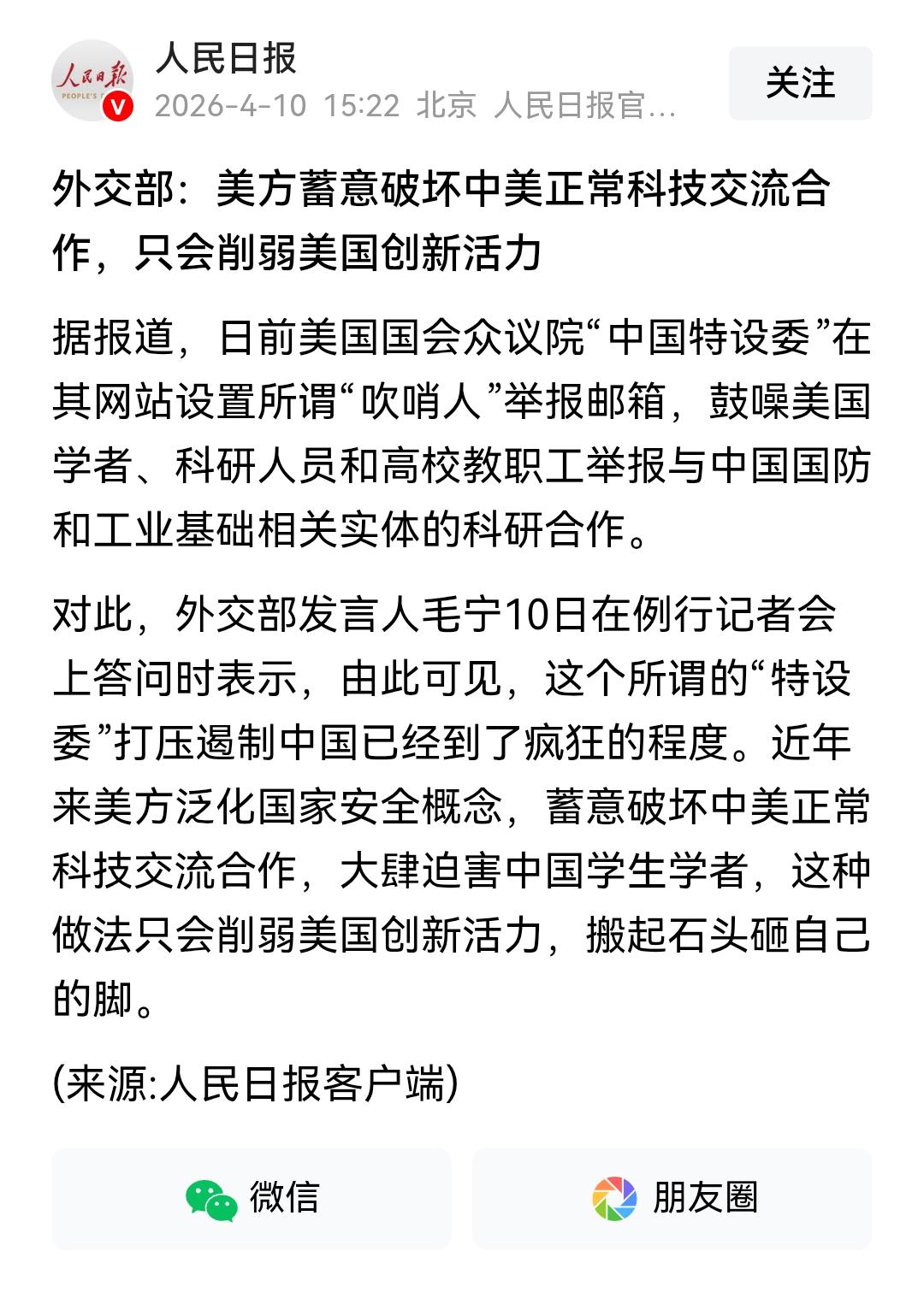 美国泛化国家安全,动辄就对中国的学生学者采取不友好措施。