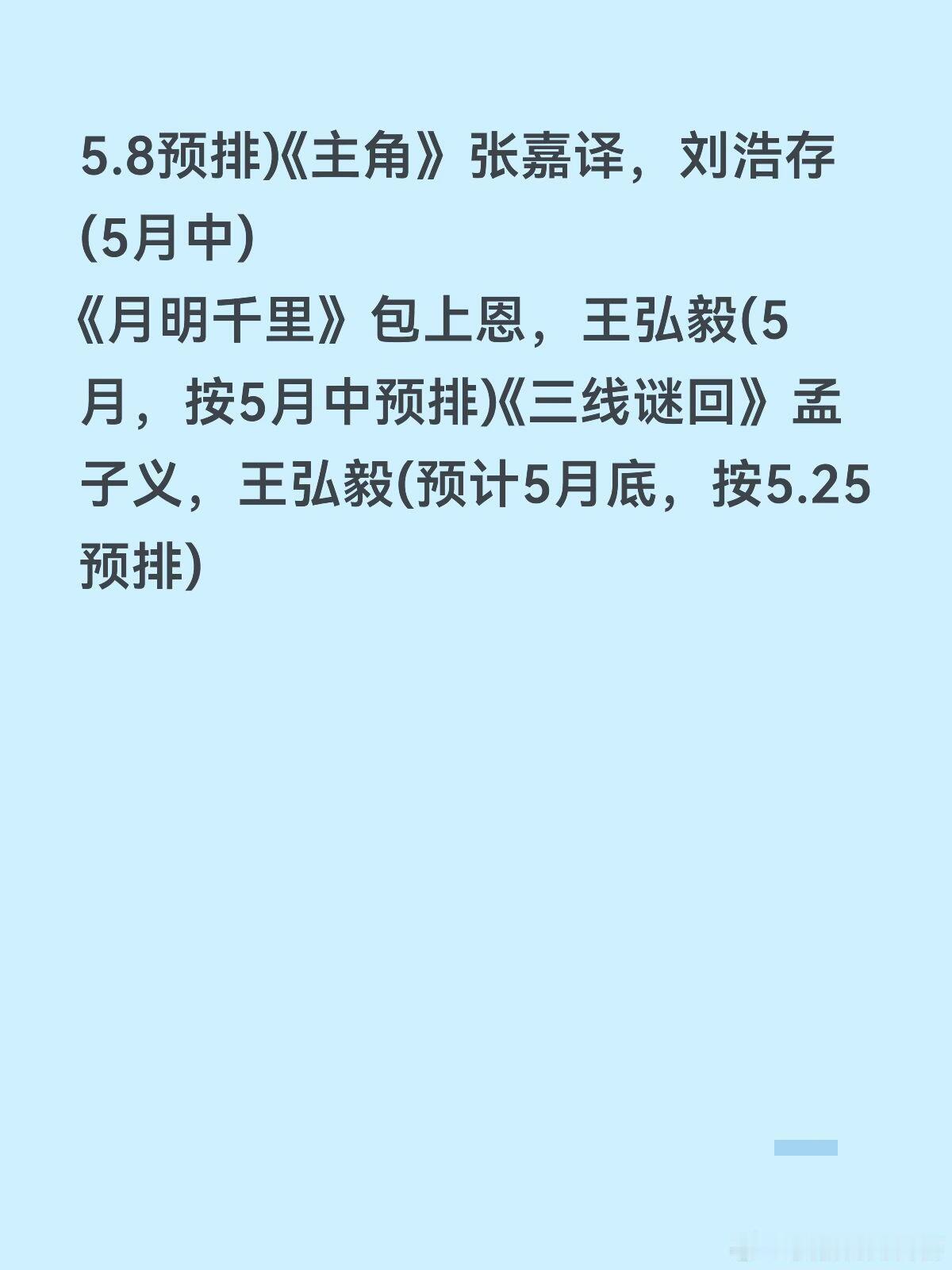 🐧大剧排播4月《蜜语记》朱珠,钟汉良(预计4.13,拼播爱奇艺)《方圆八百米》许凯,丁勇岱,邓恩熙(预计4.17)《佳偶天成》王鹤润,任嘉伦(预计4.25,拼播爱奇艺)《迷墙》4月下(按4.25预排)《爱情没有神话》4月底(4.29预排,央8)5月《古乐风华录》李一桐(5月初,按5.8预排)《主角》张嘉译,刘浩存(5月中)《月明千里》包上恩,王弘毅(5月,按5月中预排)《三线谜回》孟子义,王弘毅(预计5月底,按5.25预排)