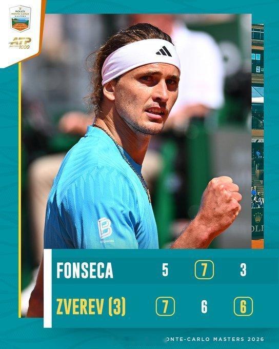 ATP1000蒙特卡洛大师赛1/4决赛,3号种子兹维列夫鏖战三盘,以7-5 6-7(3) 6-3击败巴西小将丰塞卡,第三次跻身赛会四强、第26次打进大师赛四强,静候辛纳与阿利亚西姆的胜者。蒙特卡洛1000赛红土撒野季ATP