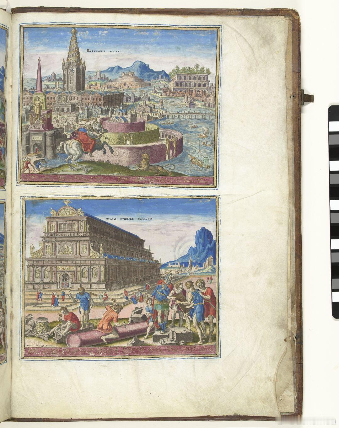 历史知识 荷兰版画家菲利普·加勒(Philip Galle ,1537 年 - 1612 年)1572年创作于安特卫普的彩色版画《世界八大奇迹之巴比伦城墙》。画面中可见塞弥拉弥斯女王(Semiramis,希腊神话中的传奇亚述王后,真实原型是前810-前805年统治帝国的亚述摄政王后萨穆-拉玛特)身穿亚马逊女战士服装正在与狮子搏斗。背景包括空中花园和巴别塔。荷兰国立博物馆收藏。