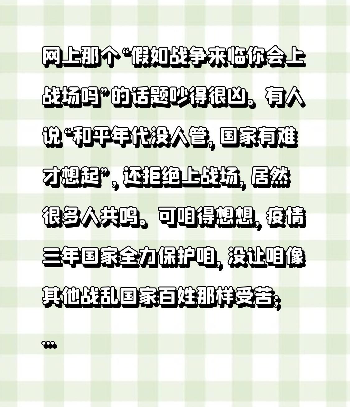 网上那个“假如战争来临你会上战场吗”的话题吵得很凶。有人说“和平年代没人管,国家有难才想起”,还拒绝上战场,居然很多人共鸣。
