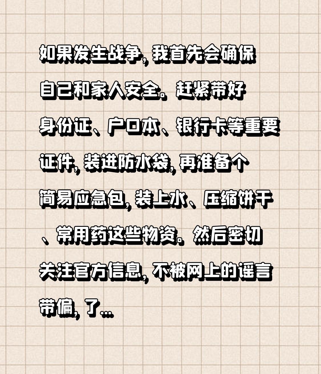 如果发生战争,我首先会确保自己和家人安全。赶紧带好身份证、户口本、银行卡等重要证件,装进防水袋,再准备个简易应急包,装上水、压缩饼干、常用药这些物资。