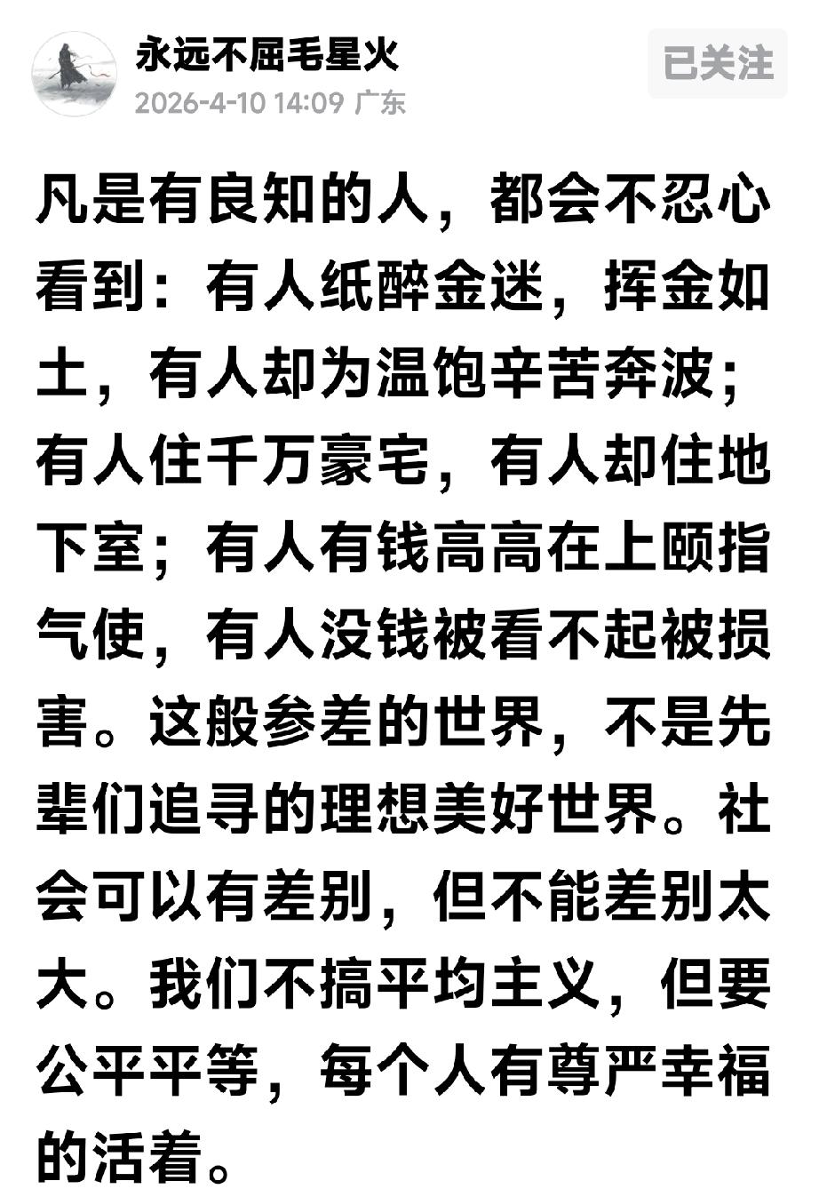 ——“凡是有良知的人,都会不忍心看到:有人纸醉金迷,挥金如土,有人却为温饱辛苦奔波;有人住千万豪宅,有人却住地下室;有人有钱高高在上颐指气使,有人没钱被看不起被损害。这般参差的世界,不是先辈们追寻的理想美好世界。社会可以有差别,但不能差别太大。我们不搞平均主义,但要公平平等,每个人有尊严幸福的活着。”