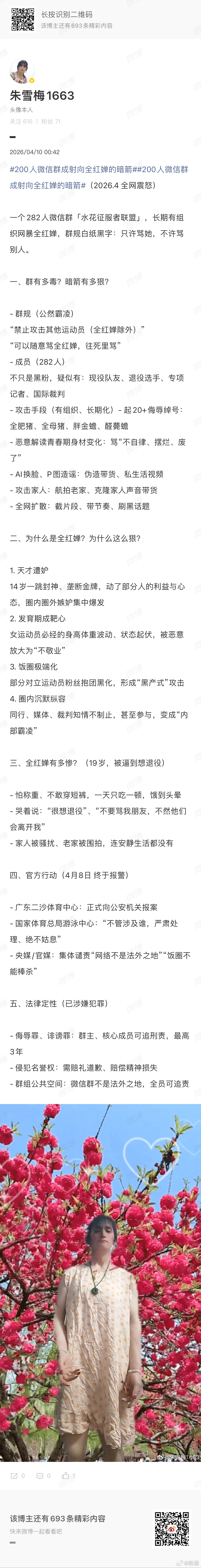 起底水花征服联盟微信群 就是给全红婵发个声,几个坏东西就各种方式诽谤举报,这次广东公安抓了这个群主31岁的徐鑫,因为之前为首的上海的郭文倩在举报我,高度怀疑,这个群主就和郭文倩在一个地方,这是广东警方去上海抓捕,还是徐鑫在上海当地投案?几个同案同伙,和徐鑫一样,是在同一个派处所当案,还是不同地方公安联动处理?这个,还是一个谜,相信,有一天,会上央视,起底水花征服群的来龙去脉 ,坐等期待!