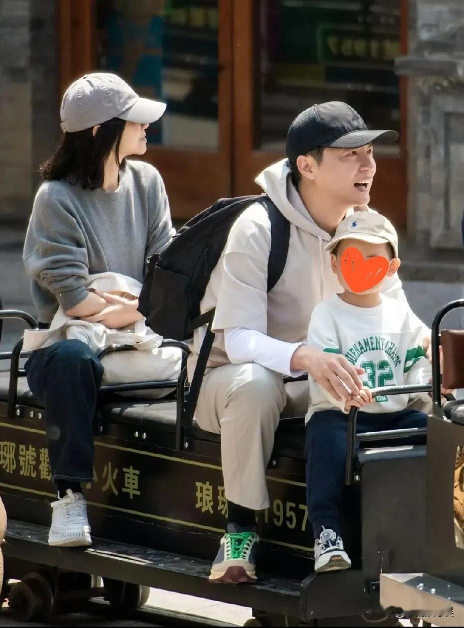 一家子三口坐着小火车,戴着棒球帽的任鲁豫穿着一件灰色卫衣,背上背着一个背包,身前坐着小儿子。老婆朱晶身材苗条,侧脸很漂亮。
