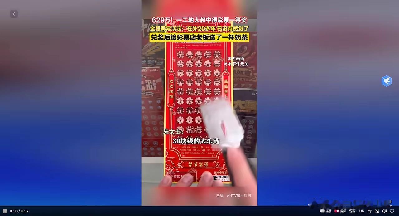 近日,安徽芜湖发生一件让人羡慕不已的幸运事,一名常年在工地务工的大叔,购买彩票后意外中得629.15万元大奖。大叔前往彩票店核对兑奖时,全程神态平静毫无激动之色,老板起初根本不敢相信,反复核验后才确认大奖属实,大叔兑奖后还特意送奶茶和老板分享喜悦。