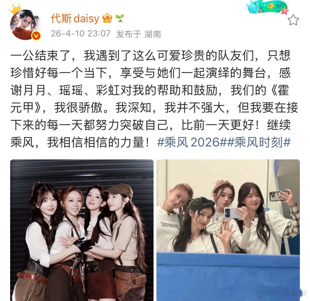 代斯一公感言代斯感谢陈瑶张月徐梦洁 代斯分享一公《霍元甲》舞台感悟,字里行间都是对舞台的热爱舞台上的她又飒又美,私下里温柔又真诚,期待代斯在《乘风2026》解锁更多惊喜,继续乘风而上