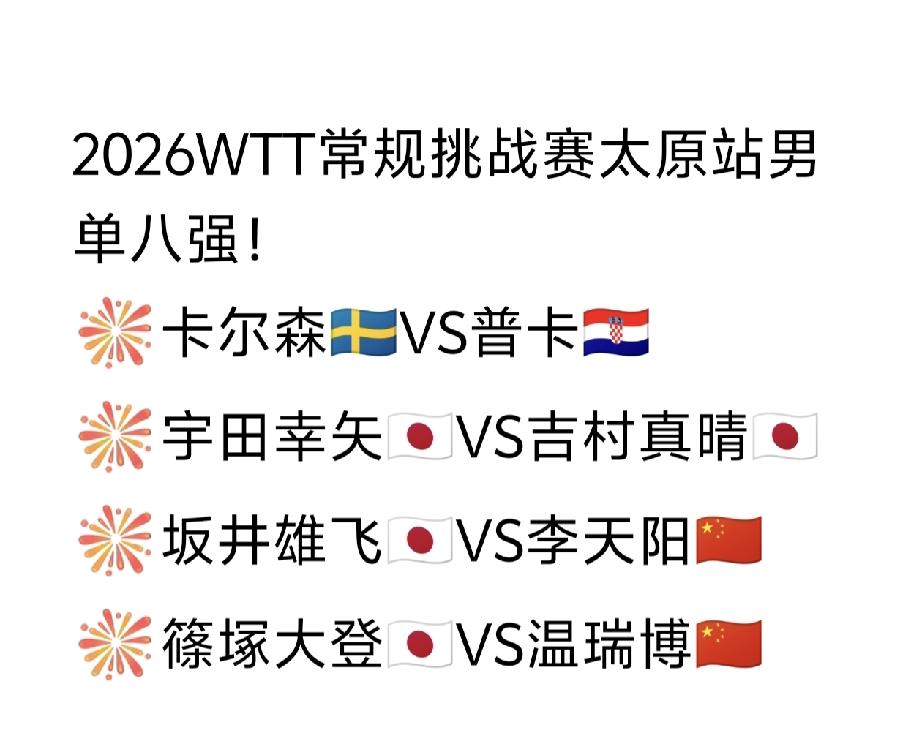 2026WTT常规挑战赛太原站男单、女单八强如图所示。