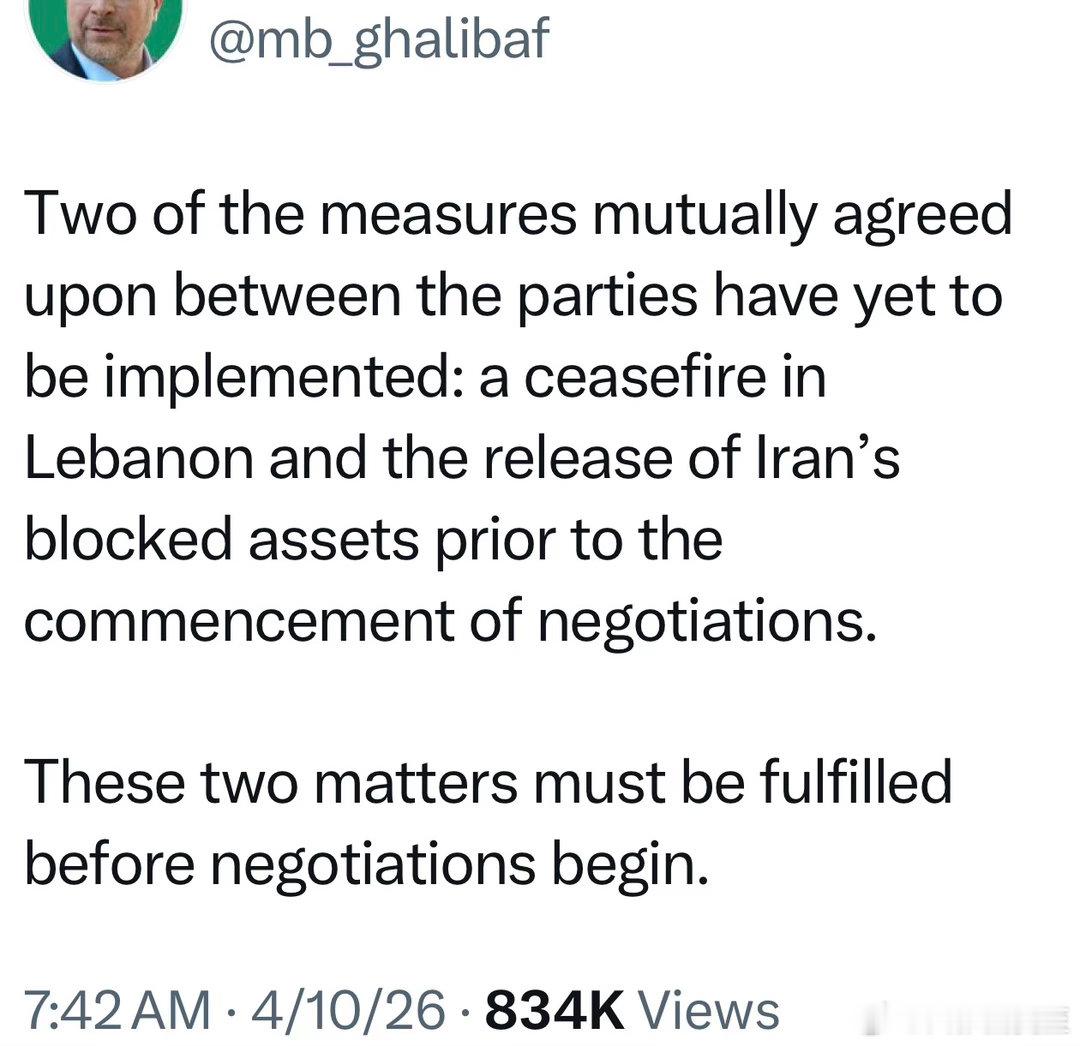 但伊朗方面代表(议长),突然宣布:在黎巴嫩停火、释放伊朗被冻结资产,满足这两个条件,谈判才能开始