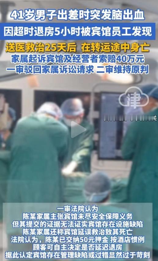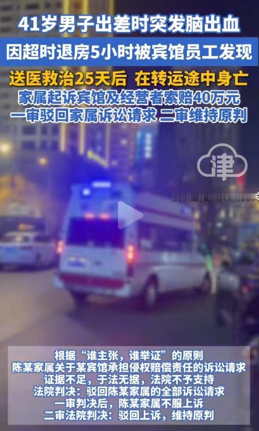 谁死谁有理?41岁男子出差时,花48块钱住了一家旅馆,押金50元。第二天退房时间到了,不见他人,店员以为他要续住,也就没在意,谁知过了5个小时,还不见动静,店员意识到不对劲,马上报警。进入房间后竟发现男子一动不动倒在地上,送医后发现是脑出血。治疗25天不见好转,转院路上,男子不幸去世。这下家属不干了,一纸诉状将旅馆告上法庭,索赔40万。