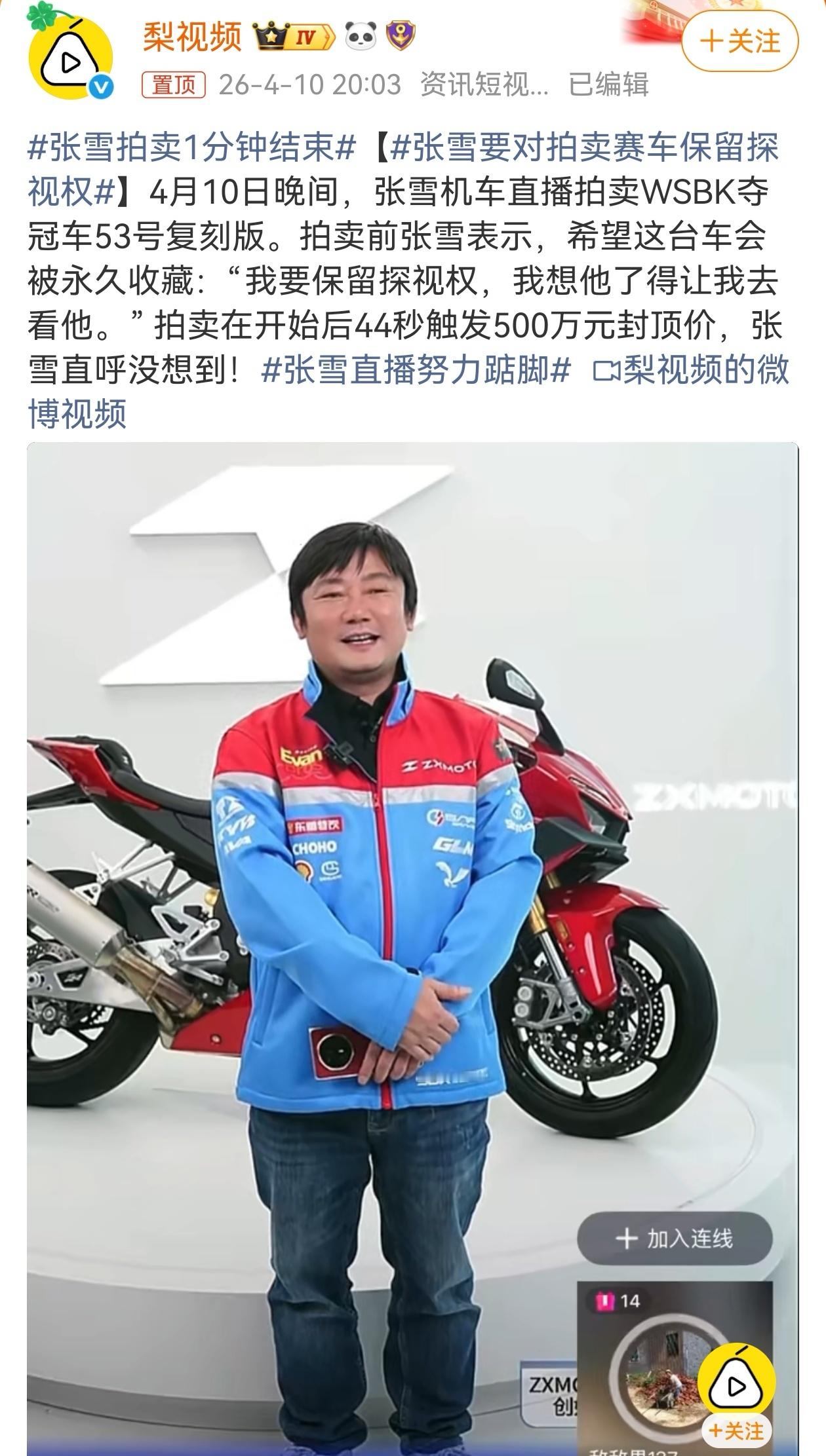 4月10日晚,张雪在直播间拍卖WSBK夺冠赛车的1:1复刻版车辆,车辆起拍价设定为40万元,设置500万元封顶价,且不允许竞拍者一次性直接出价至封顶金额,在竞拍启动后的短短几十秒内,产生了98次有效出价,开拍仅44秒便极速触顶,网友“敌敌畏137”成功加价至500万元封顶价。张雪拍卖1分钟结束张雪请李亚鹏监督捐款用在孩子身上