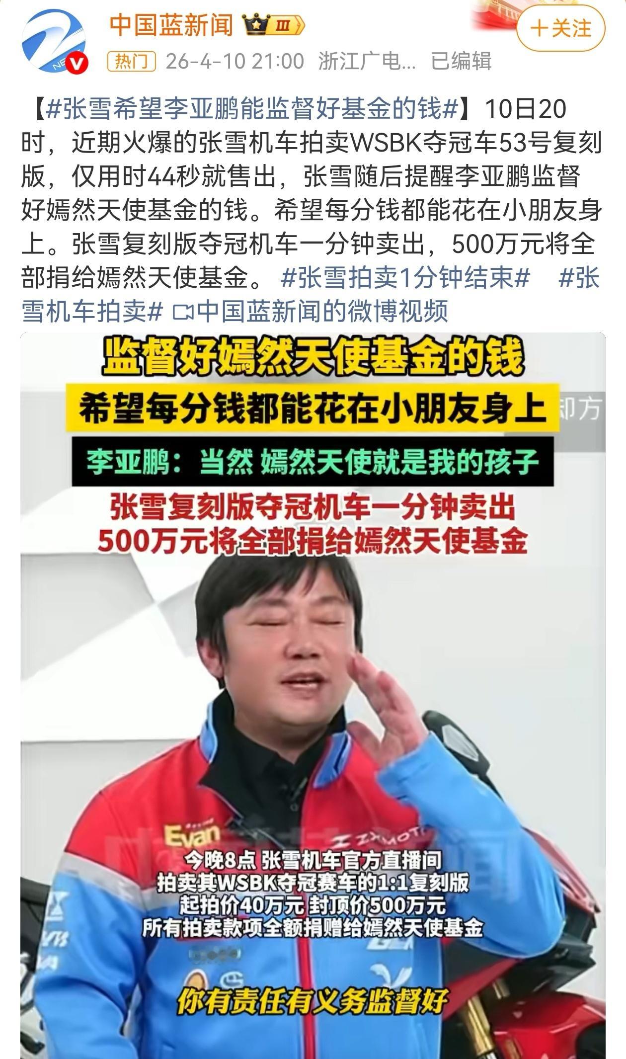 竞拍结束后,张雪还现场连线李亚鹏,李亚鹏代表嫣然天使基金,对张雪的公益举动表达了由衷感谢。从WSBK赛场夺冠打破国外品牌垄断,到拿出冠军车复刻版做公益拍卖,再到44秒极速成交传递爱心,张雪在做人做事上,都是妥妥的靠谱,不仅有着接地气的真性情,更有说到做到的人格魅力,越来越喜欢他了。张雪拍卖1分钟结束