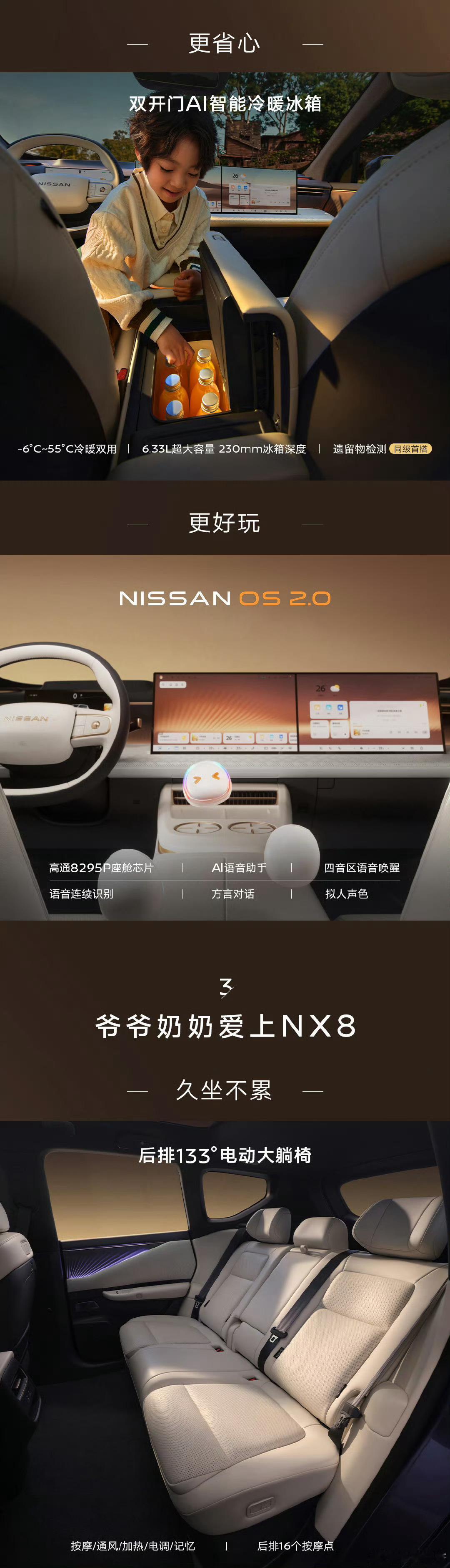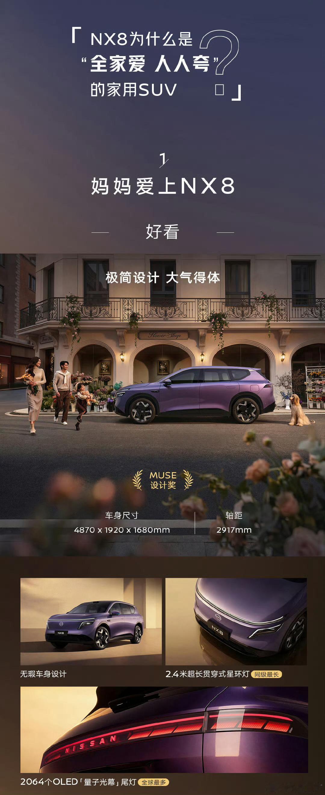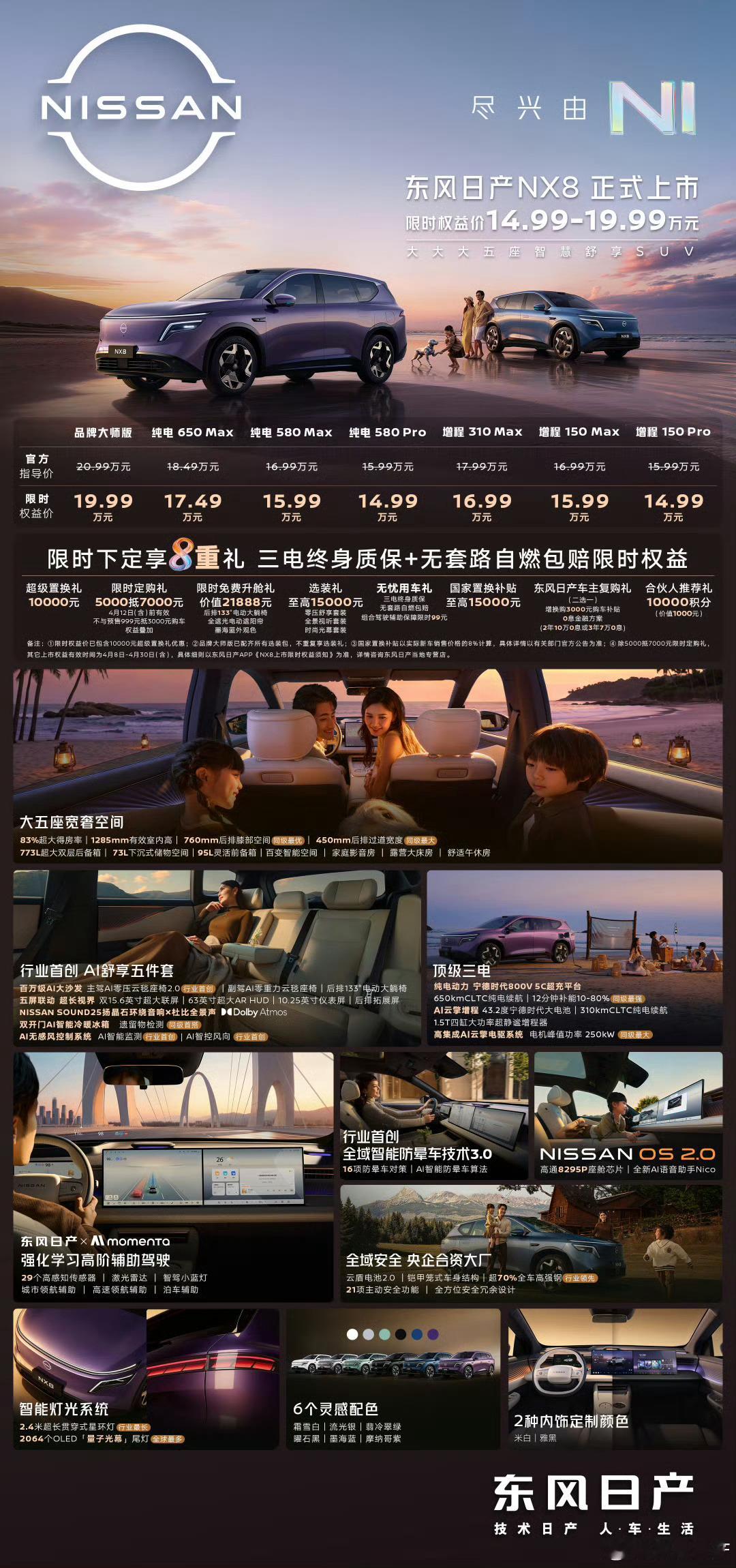 东风日产NX8大大大五座SUV预售东风日产NX8,20万级大五座家用SUV,限时14.99万起 。纯电/增程双动力,纯电800V平台5C快充,12分钟补能70%。轴距近3米,空间超大,AI零压座椅超舒服。激光雷达+高阶智驾,三联屏+8295芯片,合资新能源里配置拉满。