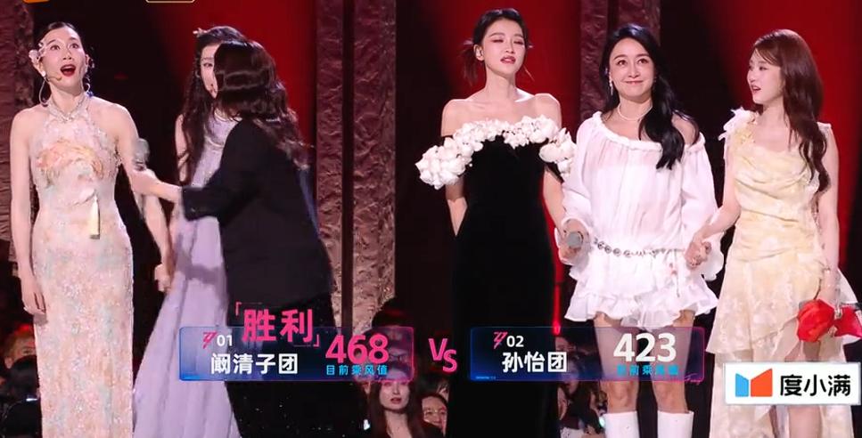 而孙怡团的姐姐们拿到了845的舞台乘风值,虽然超过了阚清子团,但是因为是上半场倒数第二的成绩,所以和阚清子两个人一起进行队 长 同唱一首歌进行pk。