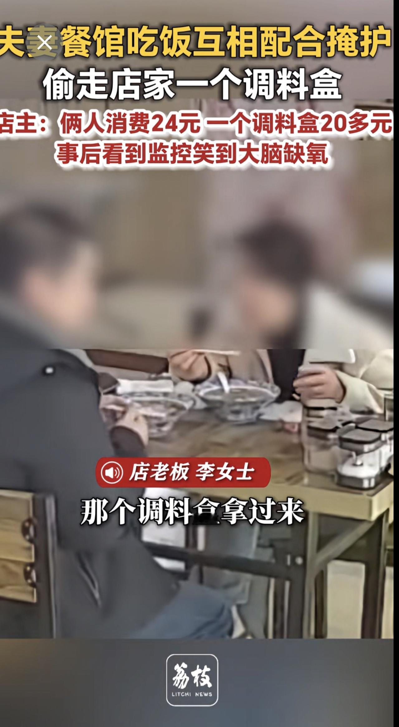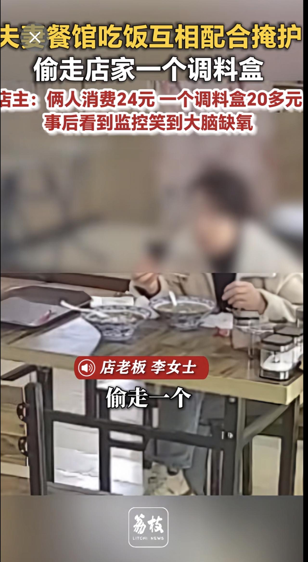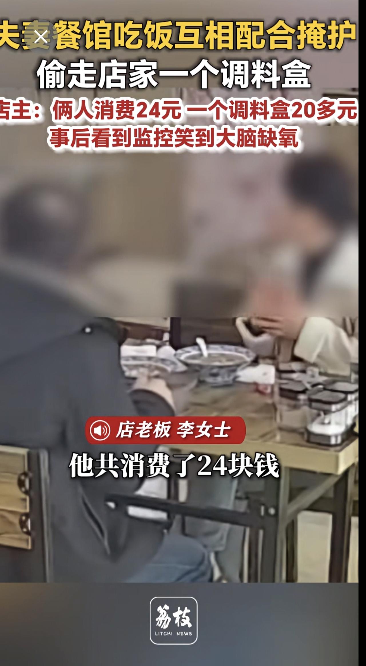 夫妻餐馆吃饭互相配合掩护 偷走店家一个调料盒 店主:俩人消费24元 一个调料盒20多元 事后看到监控笑到大脑缺氧奇葩