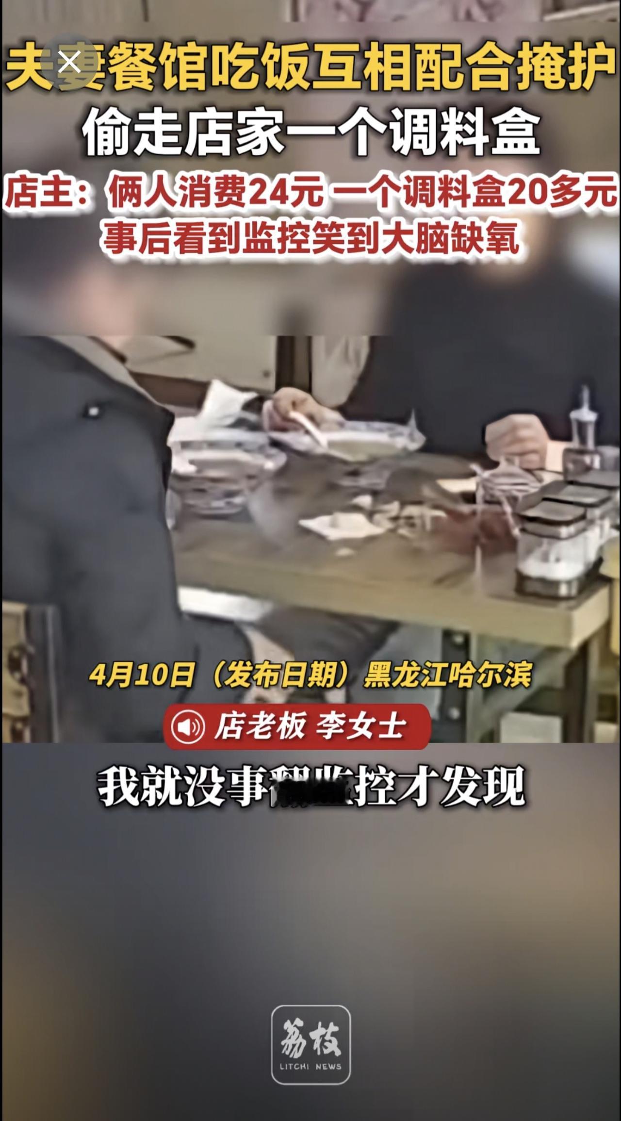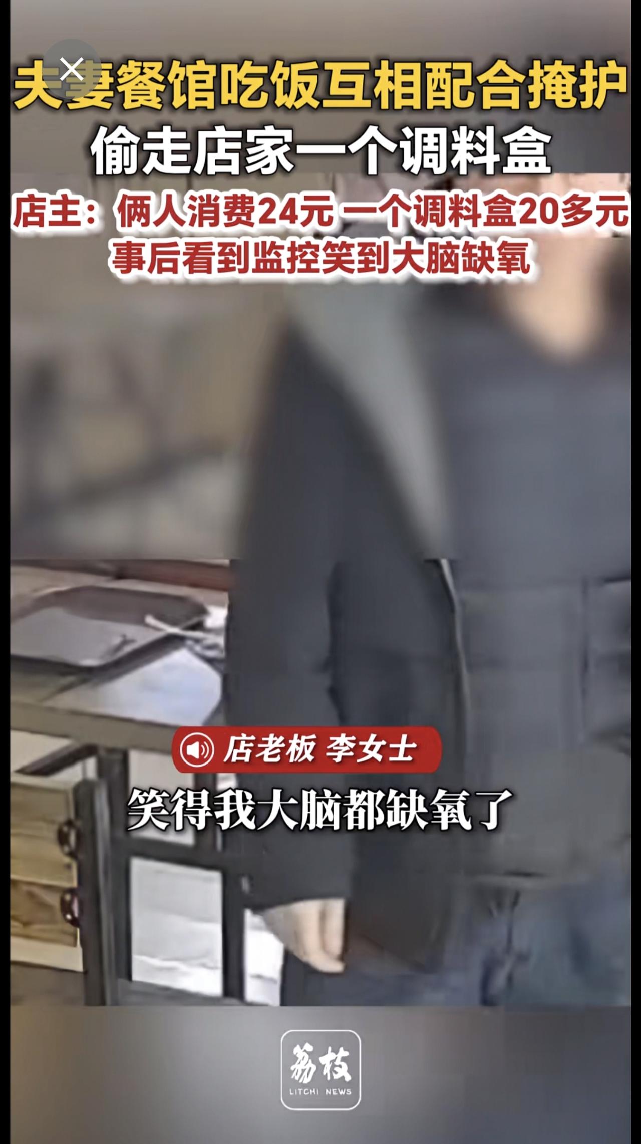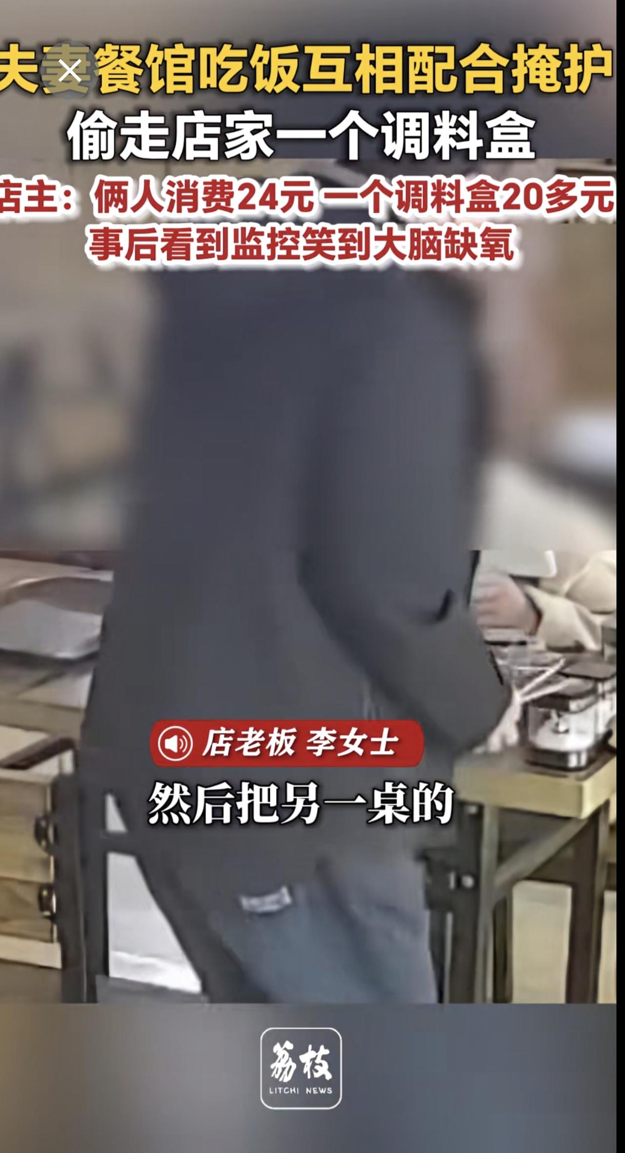 夫妻餐馆吃饭互相配合掩护 偷走店家一个调料盒 店主:俩人消费24元 一个调料盒20多元 事后看到监控笑到大脑缺氧奇葩