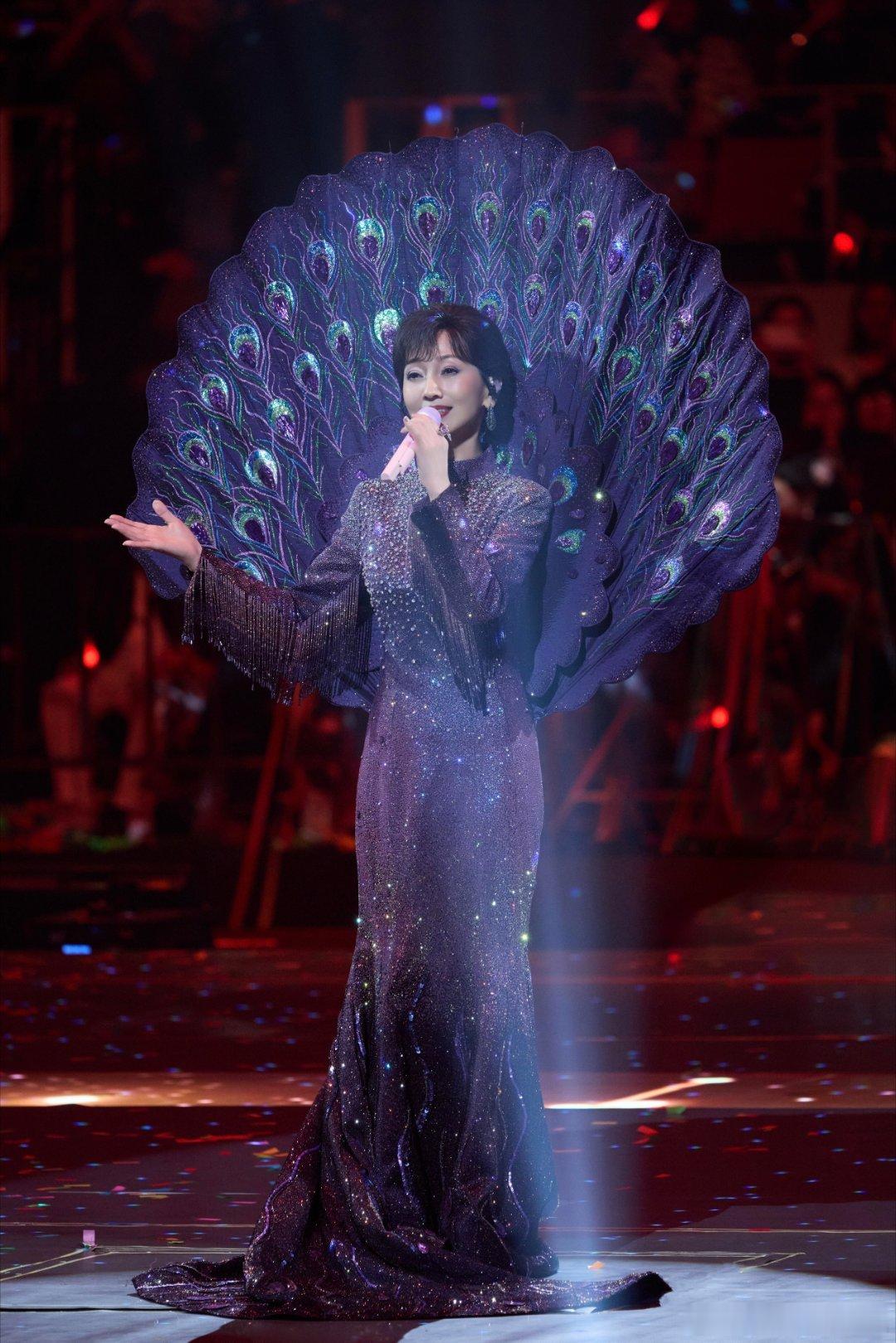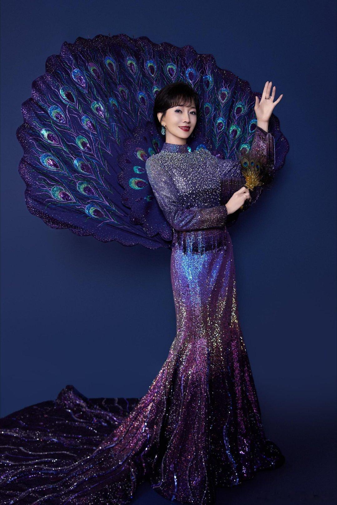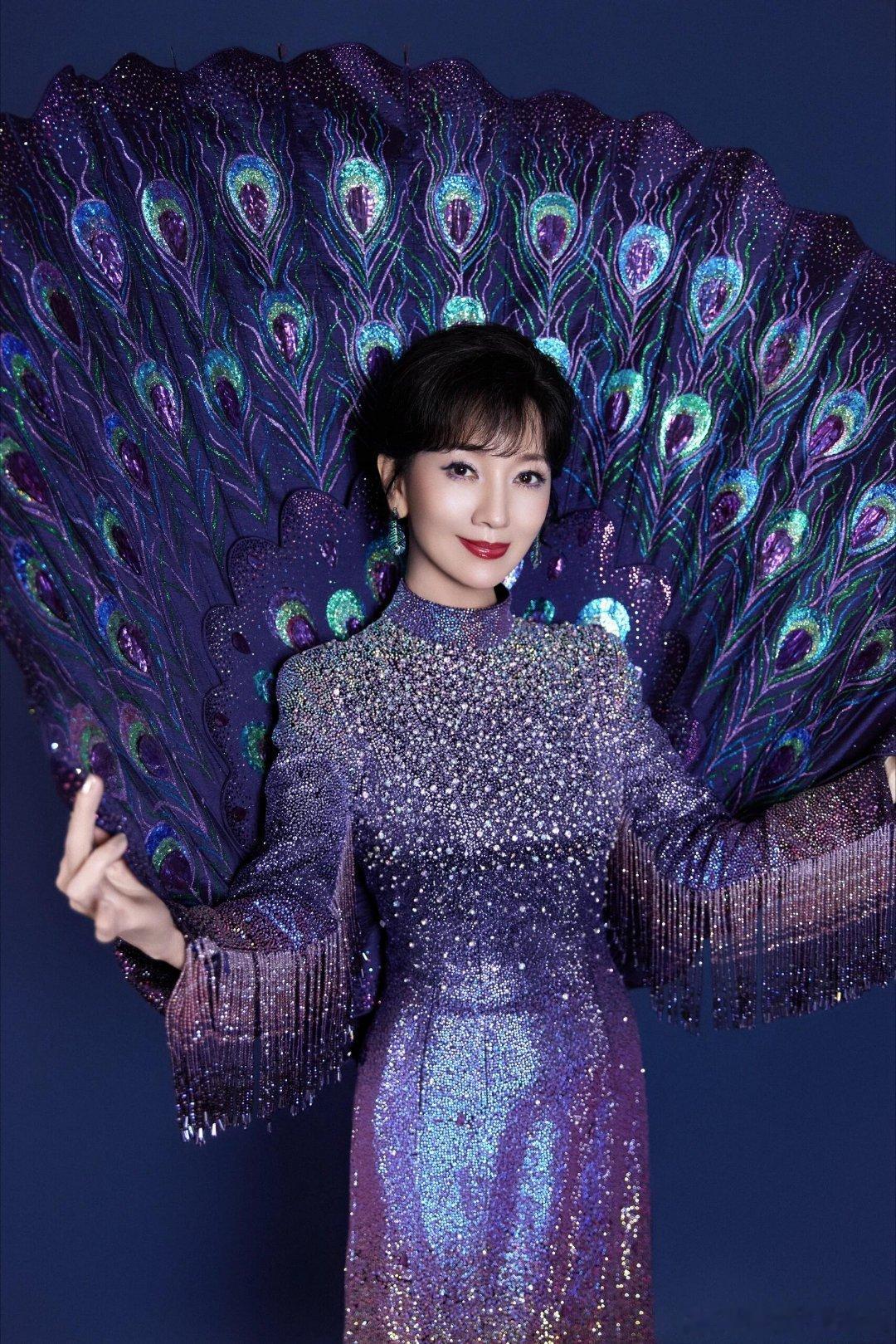 赵雅芝回忆舞台身穿六礼高定孔雀裙蓝紫渐变闪片+巨型孔雀扇,真孔雀女王!🦚