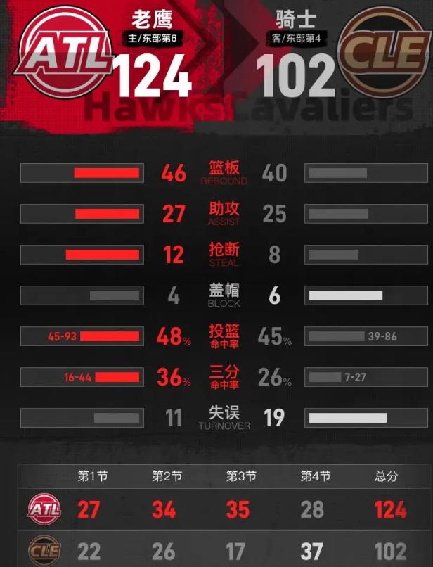 你说这场球像啥?像极了你追那姑娘——前三节对你眉开眼笑,末节直接给你拉黑。老鹰124-102骑士,看着分差够大是吧?别被Excel骗了,这就是一场心照不宣的默契局。