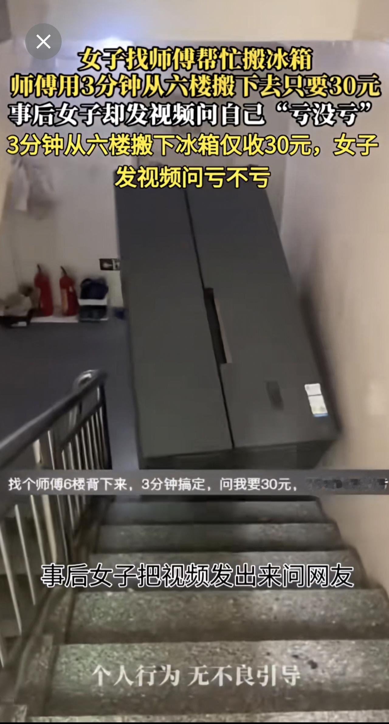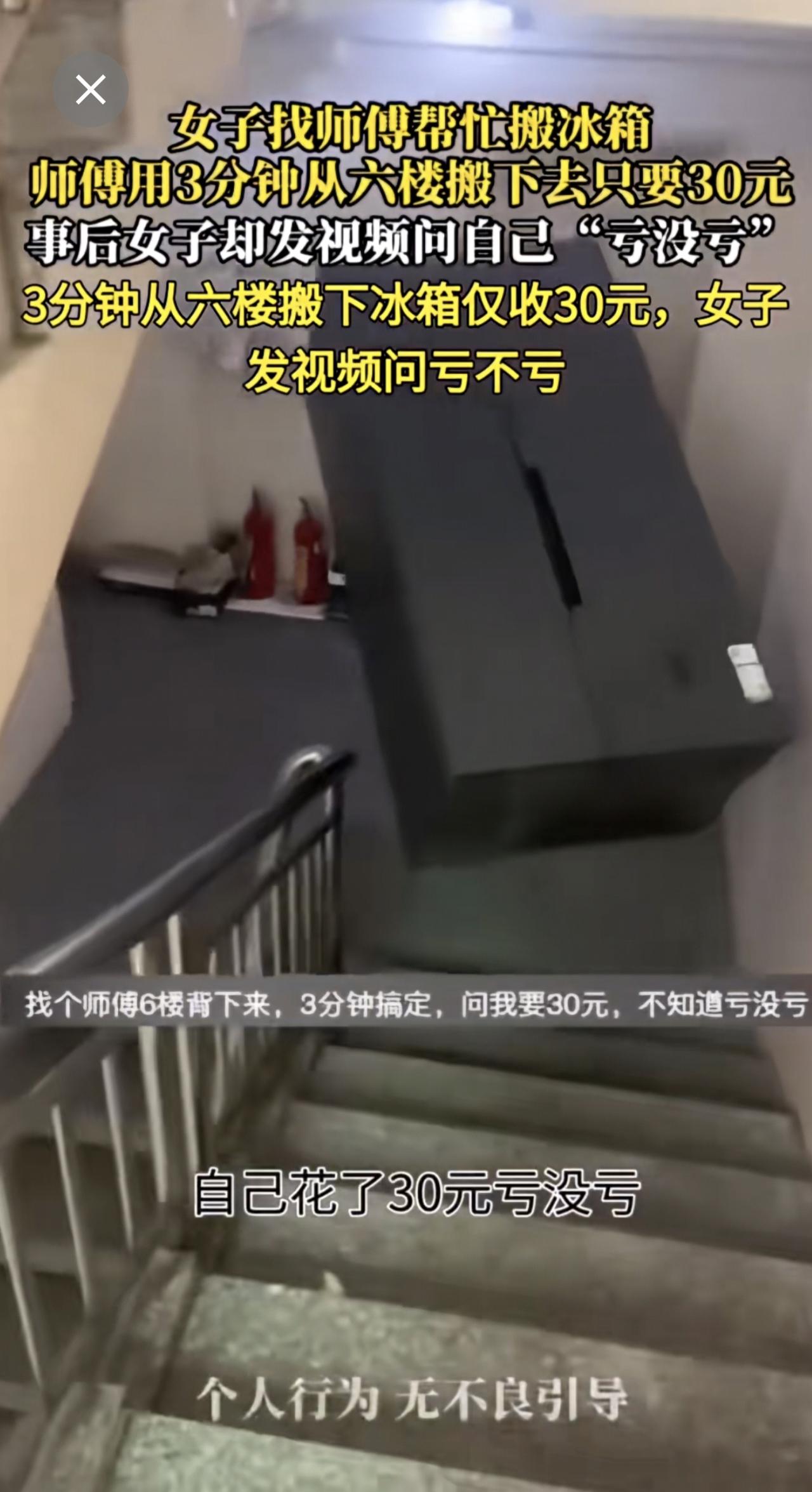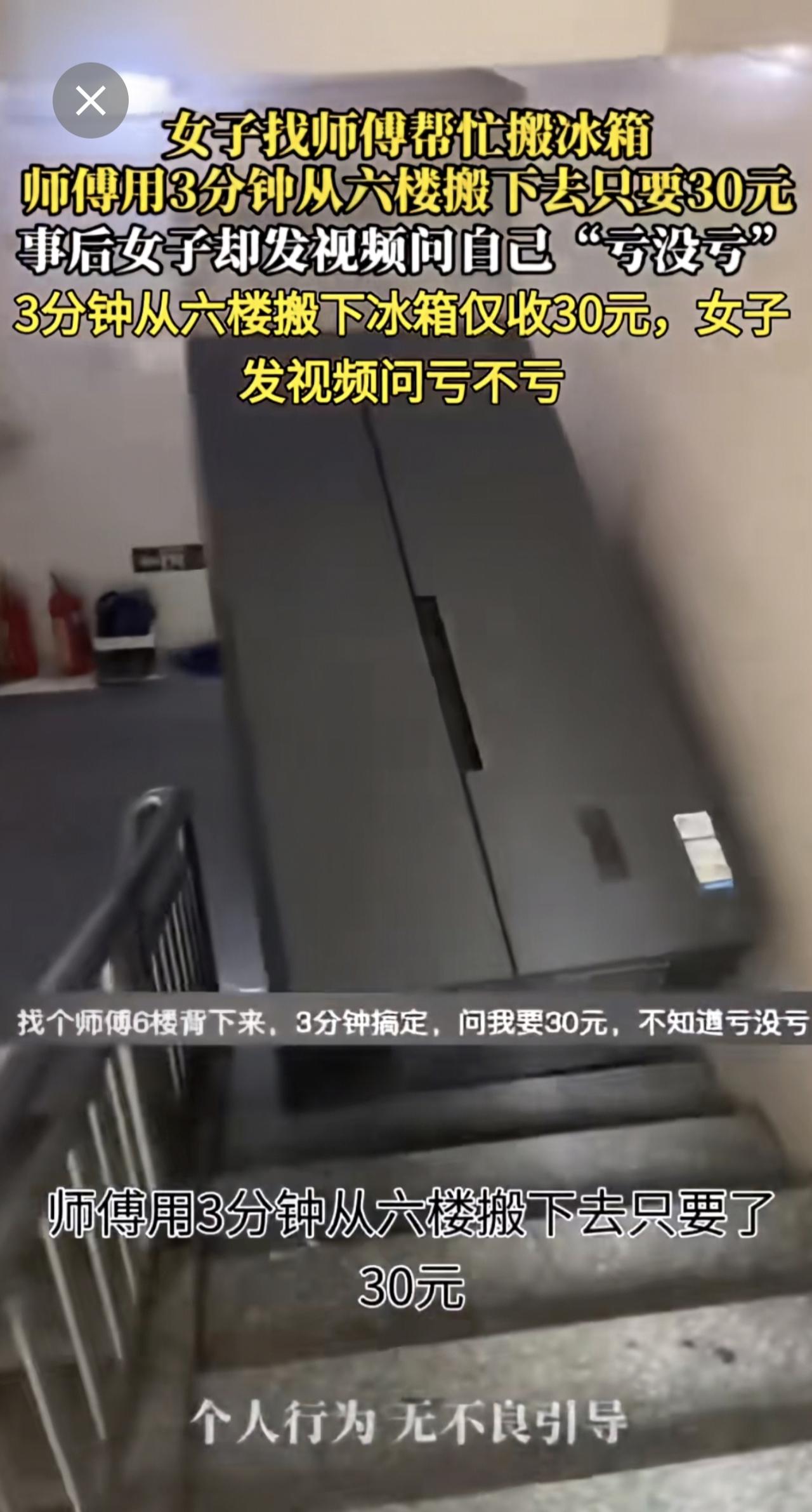 女子找师傅帮忙搬冰箱 师傅用3分钟从六楼搬下去只要30元女子质疑收费高社会百态