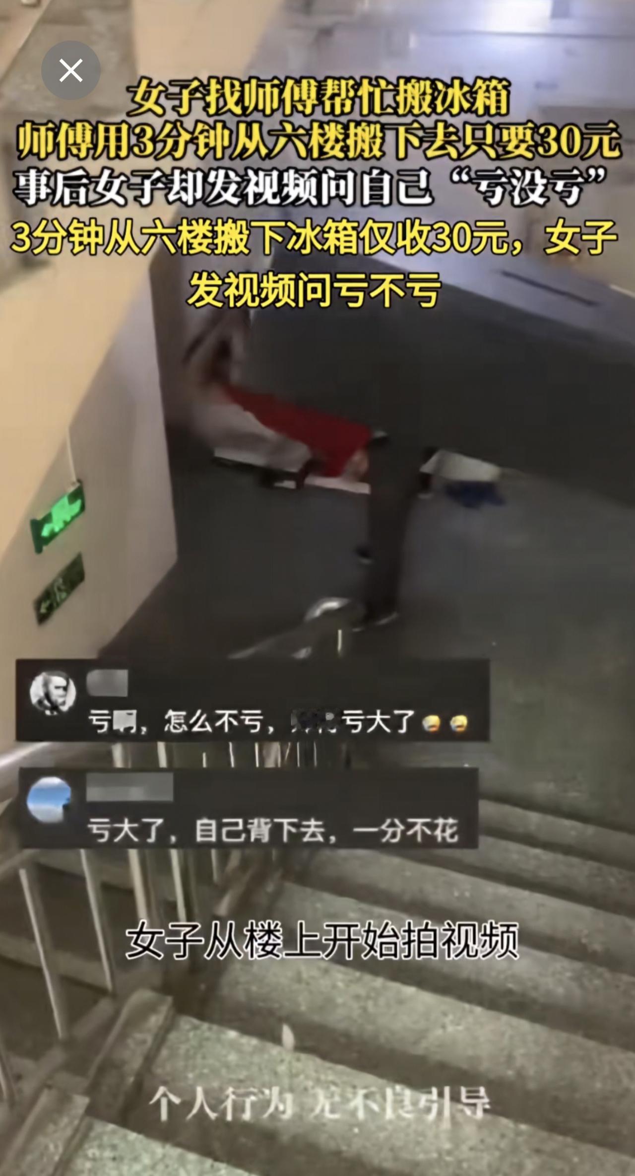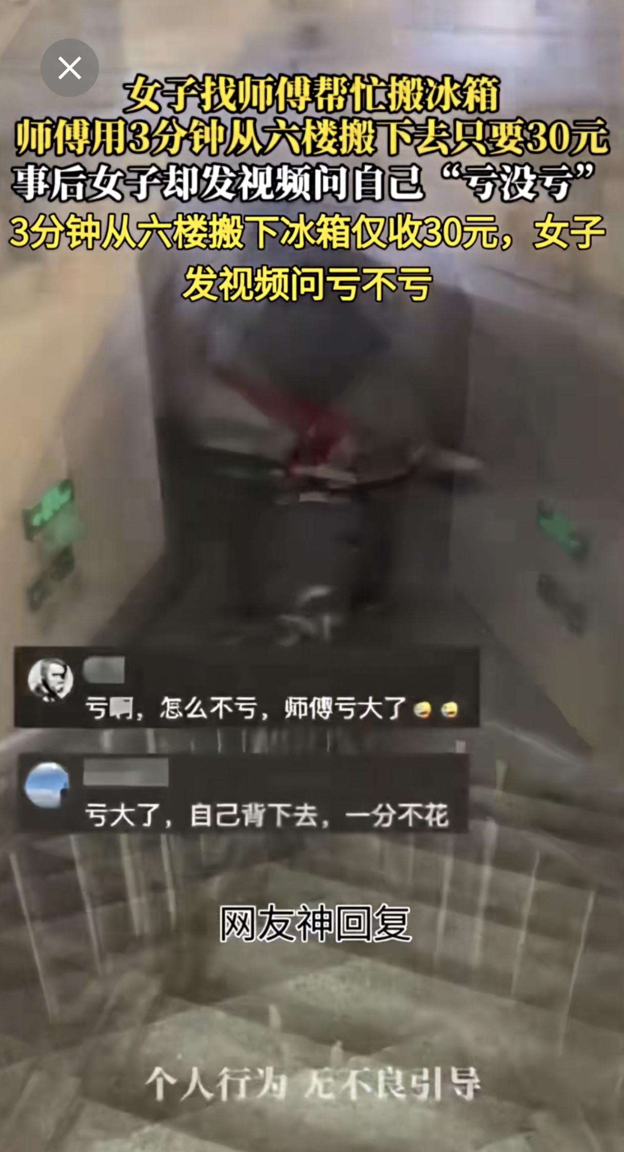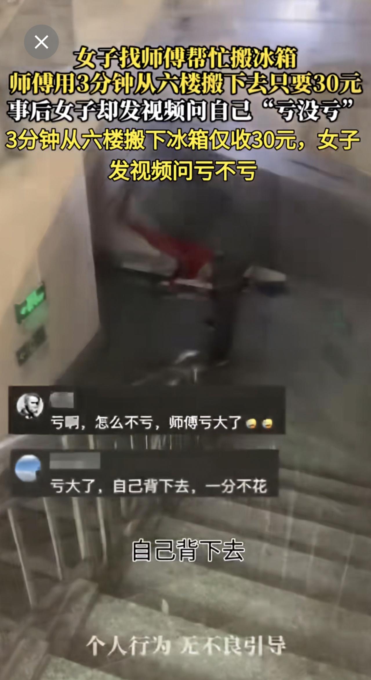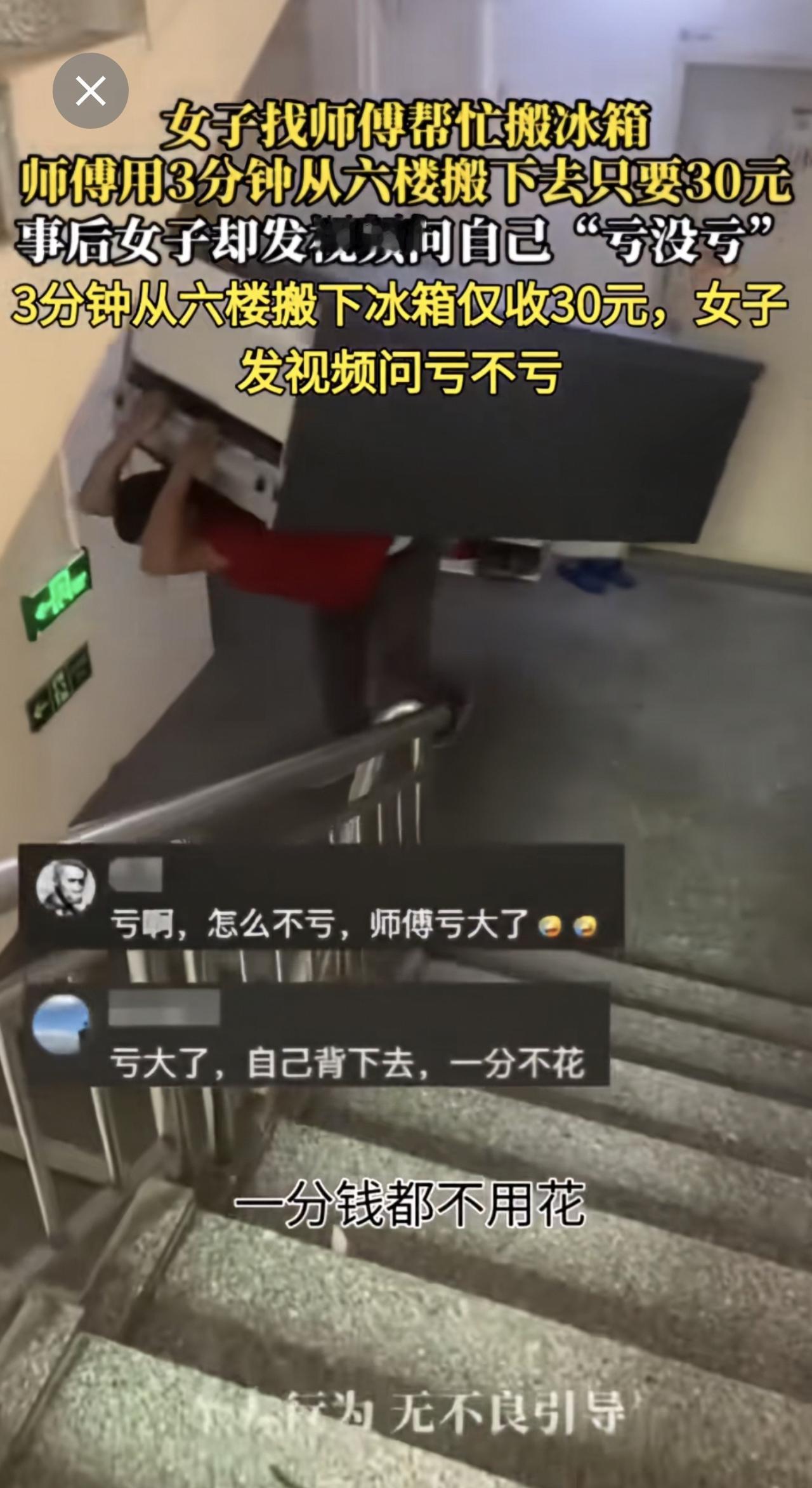 女子找师傅帮忙搬冰箱 师傅用3分钟从六楼搬下去只要30元女子质疑收费高社会百态