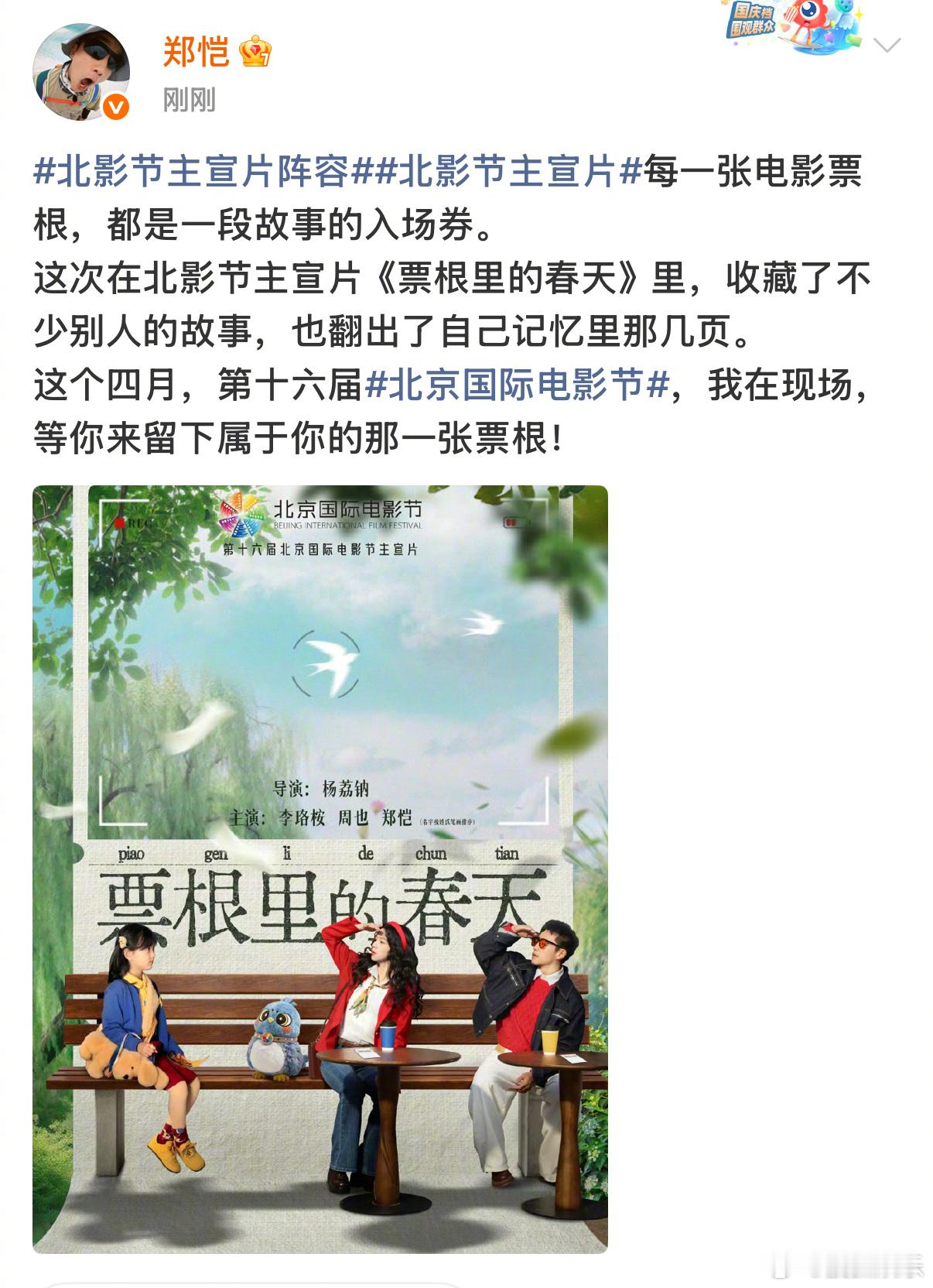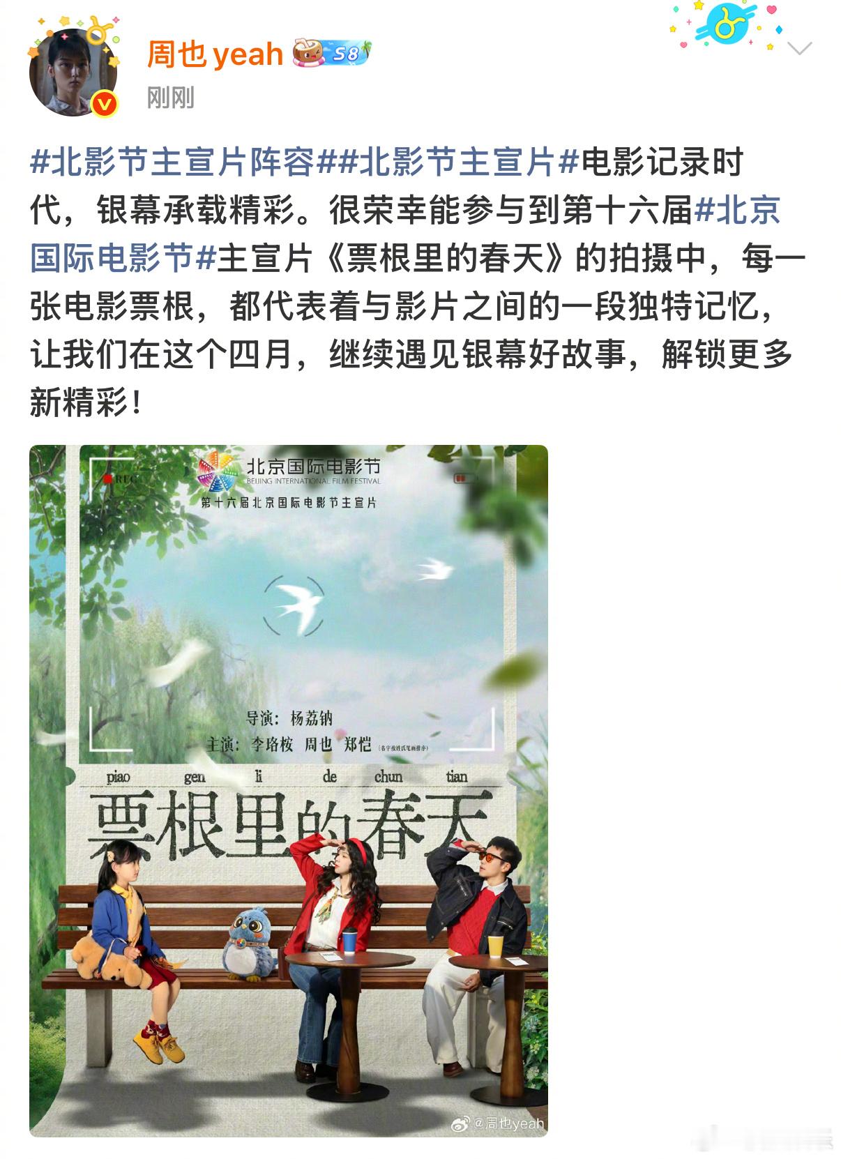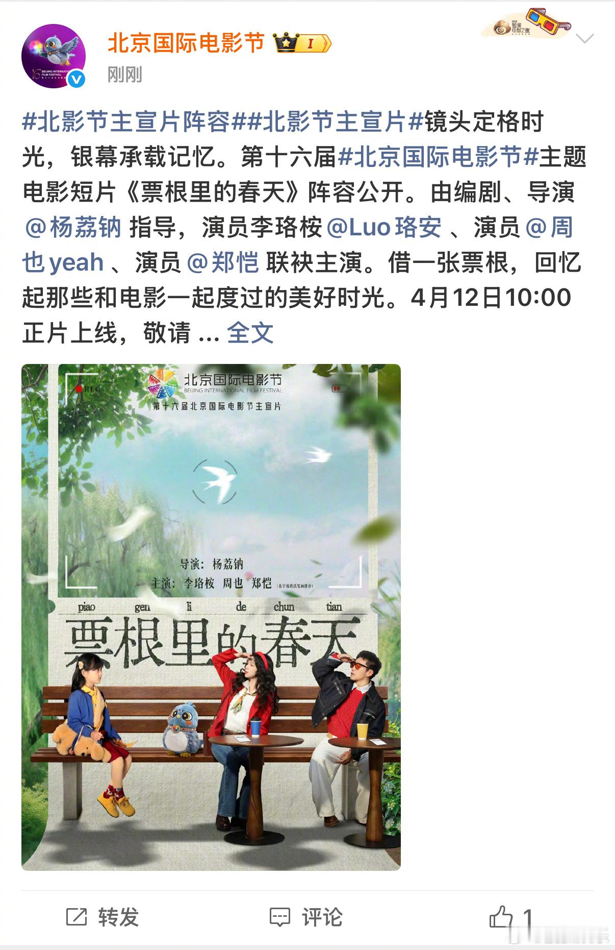 第十六届公开主宣传片《票根里的春天》阵容,主演周也、郑恺 。4月12日10:00正片上线,4月北影节见