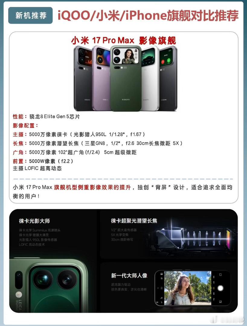 📸 小米17 Pro Max:影像全能水桶机同骁龙8E5,但徕卡三摄+潜望长焦直接把拍照拉到顶,5X长焦+微距拍啥都清晰。7500mAh大电池+50W无线充,续航直接焊死,还有背屏设计玩出花,5999起,爱拍照、要长续航的直接冲。