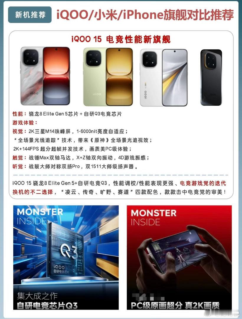 🔥 iQOO 15:纯纯电竞党本命机骁龙8E5+自研Q3电竞芯片直接焊死性能,2K 144Hz直屏+6000nit峰值亮度,《原神》光追拉满都不卡。7000mAh大电池+100W快充,打一天游戏都不慌,战锤双马达+双扬直接把沉浸感拉满,4499起的价格,学生党、游戏党闭眼入。