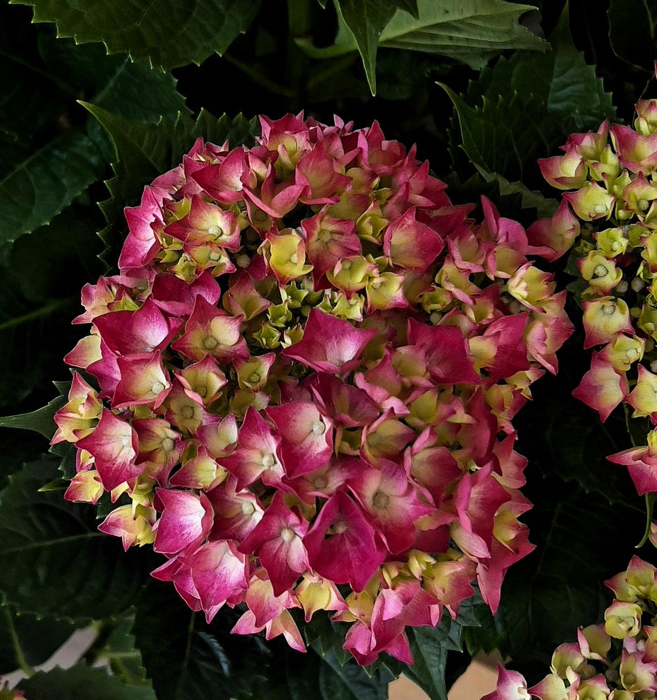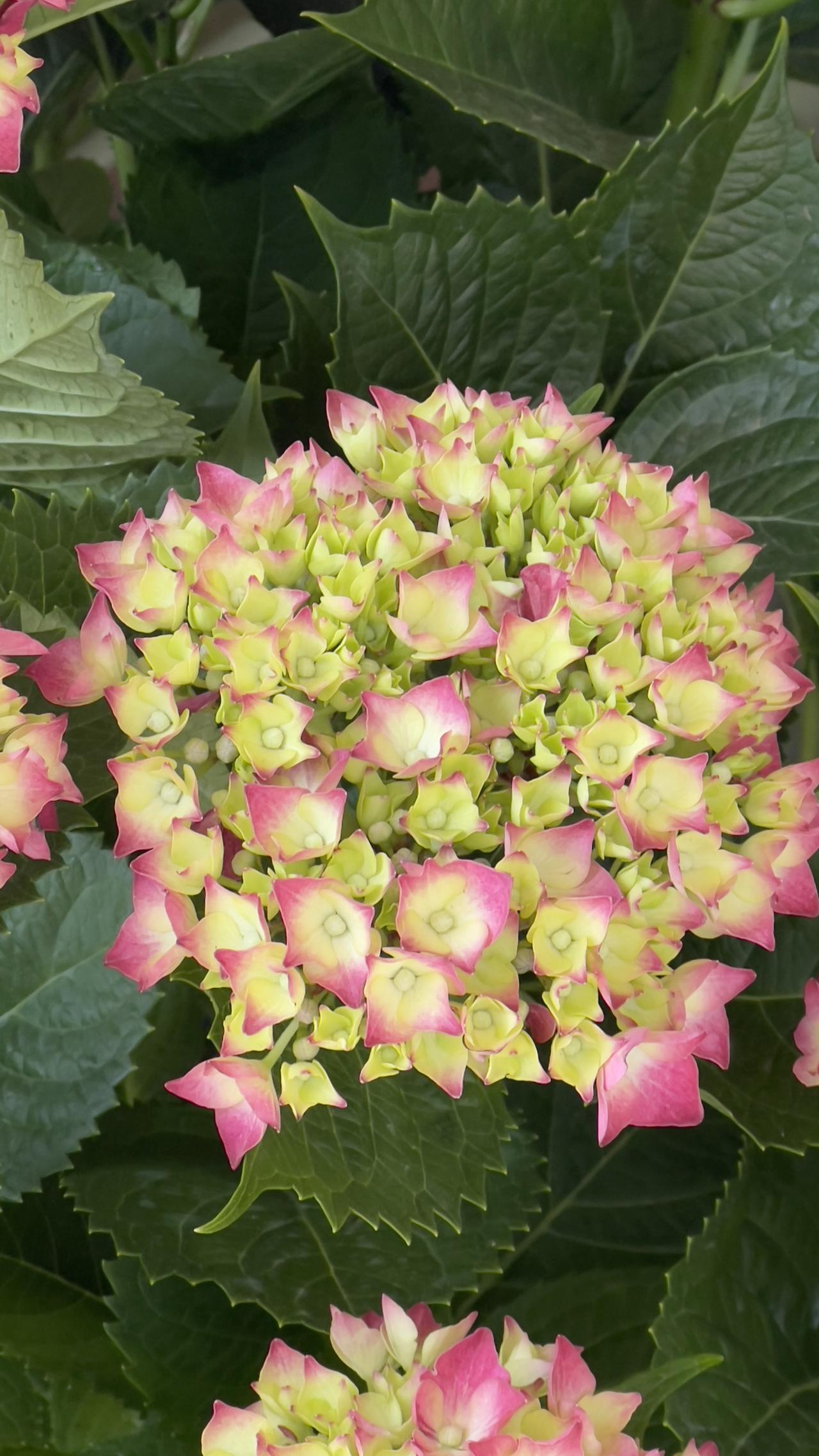 大花绣球也叫八仙花/紫阳花),属于虎耳草科绣球属的园艺观赏品种,这是粉黄复色的培育品种,图中呈现的是它初开阶段的状态。