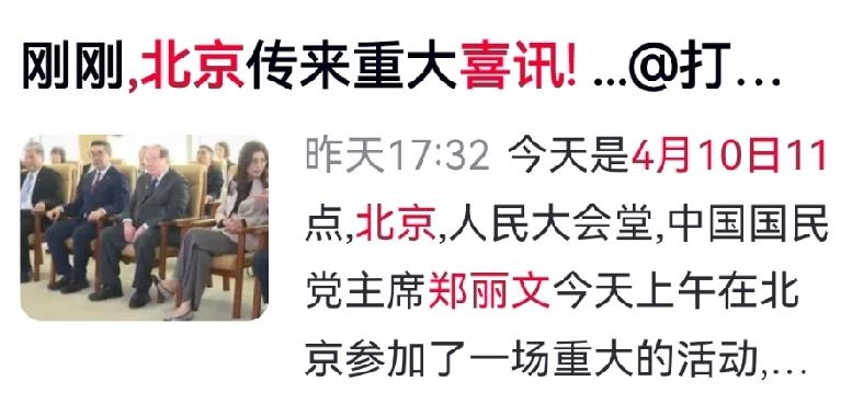 4月10日11时,人民大会堂传来重大消息,国民党主席郑丽文出席两岸重要活动,以“四个坚持”为两岸关系锚定总方向:坚持正确认同促心灵契合、和平发展护家园、交流融合惠民生、团结奋斗谋复兴。