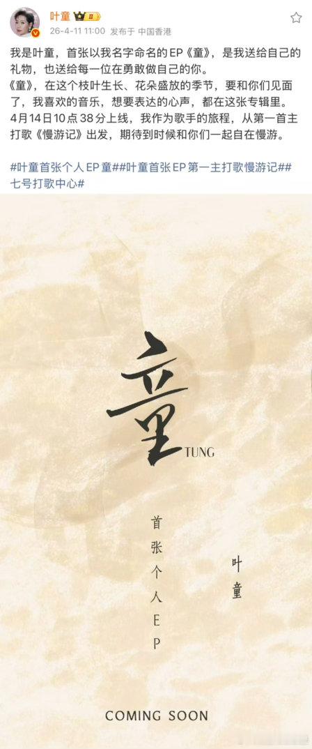 叶童首张个人EP童 这一次她是歌手!筹备多时的首张个人EP《童》今日正式官宣,像她作为演员全情投入角色一样,这一次,她将自己化为流动的旋律,将炽烈的情感、鲜活的记忆和旺盛的生命力融入每一个音符,以最原始的自然肌理,承载最自由、最快乐的生命力。 EP第一主打歌《慢游记》4月14日10:38准时上线,一起期待!叶童 叶童首张EP第一主打歌慢游记