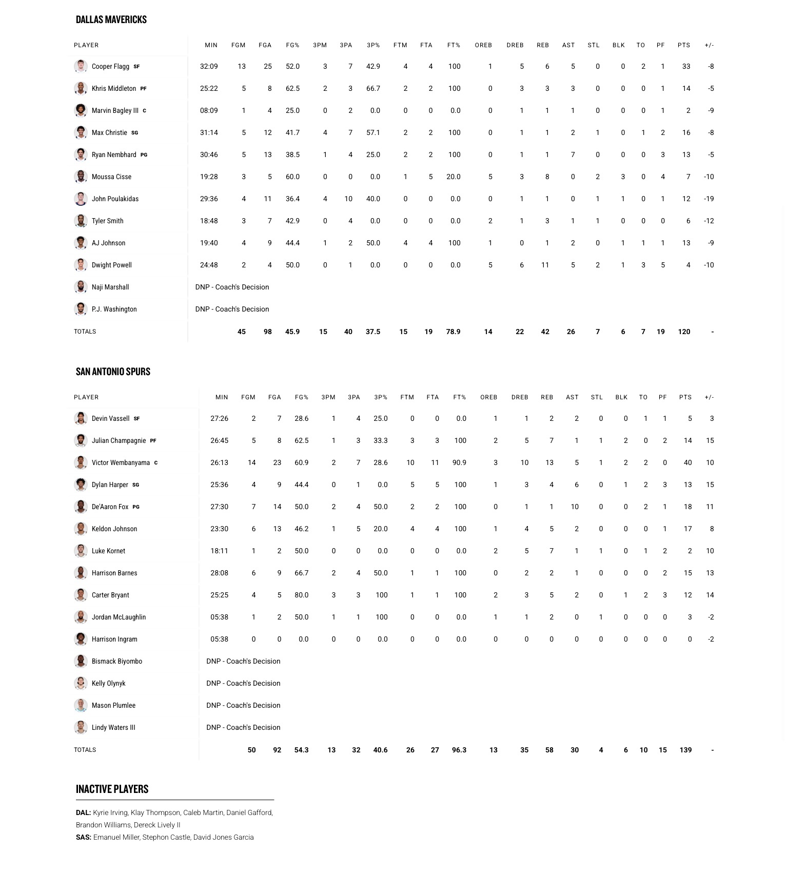全场比赛结束!马刺主场139-120轻取独行侠,拿到三连胜🎉