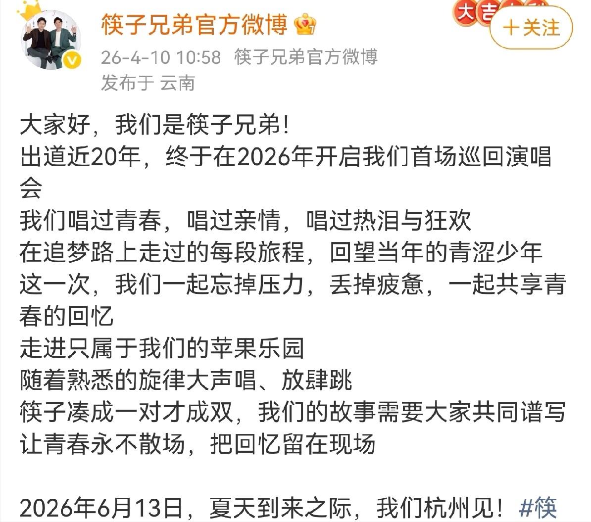 4月10日,筷子兄弟的官方账号曝光了一条消息,原来他们要开一场巡回演唱会,而这也是他们出道20年以来的第一场。
