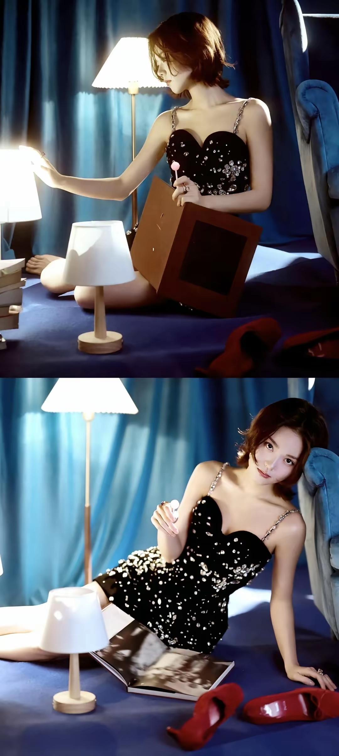 赵今麦,蓝调光影氤氲出慵懒氛围,黑丝绒碎钻吊带裙缀满细碎星光,利落短发衬出灵动飒