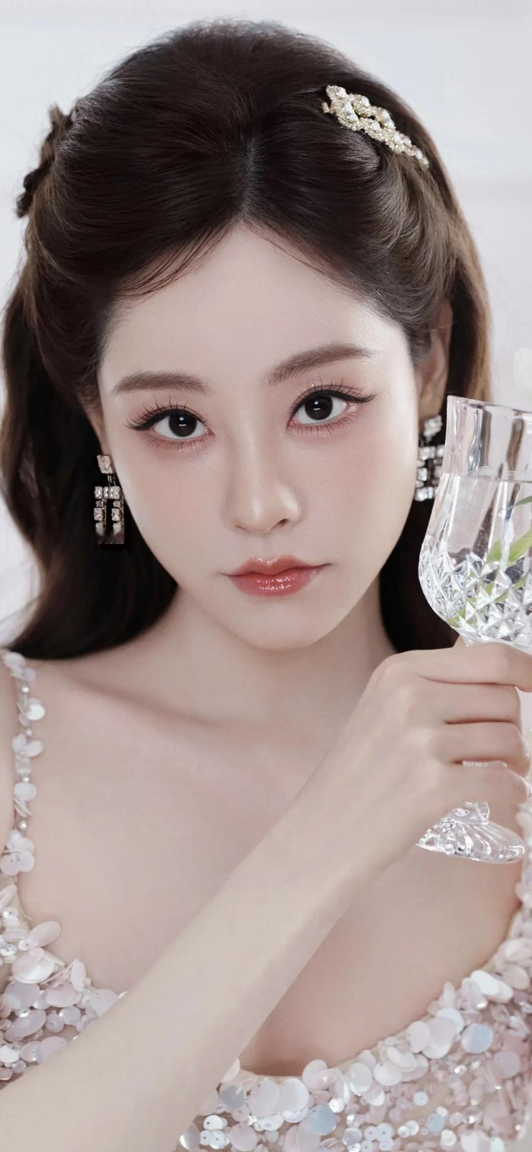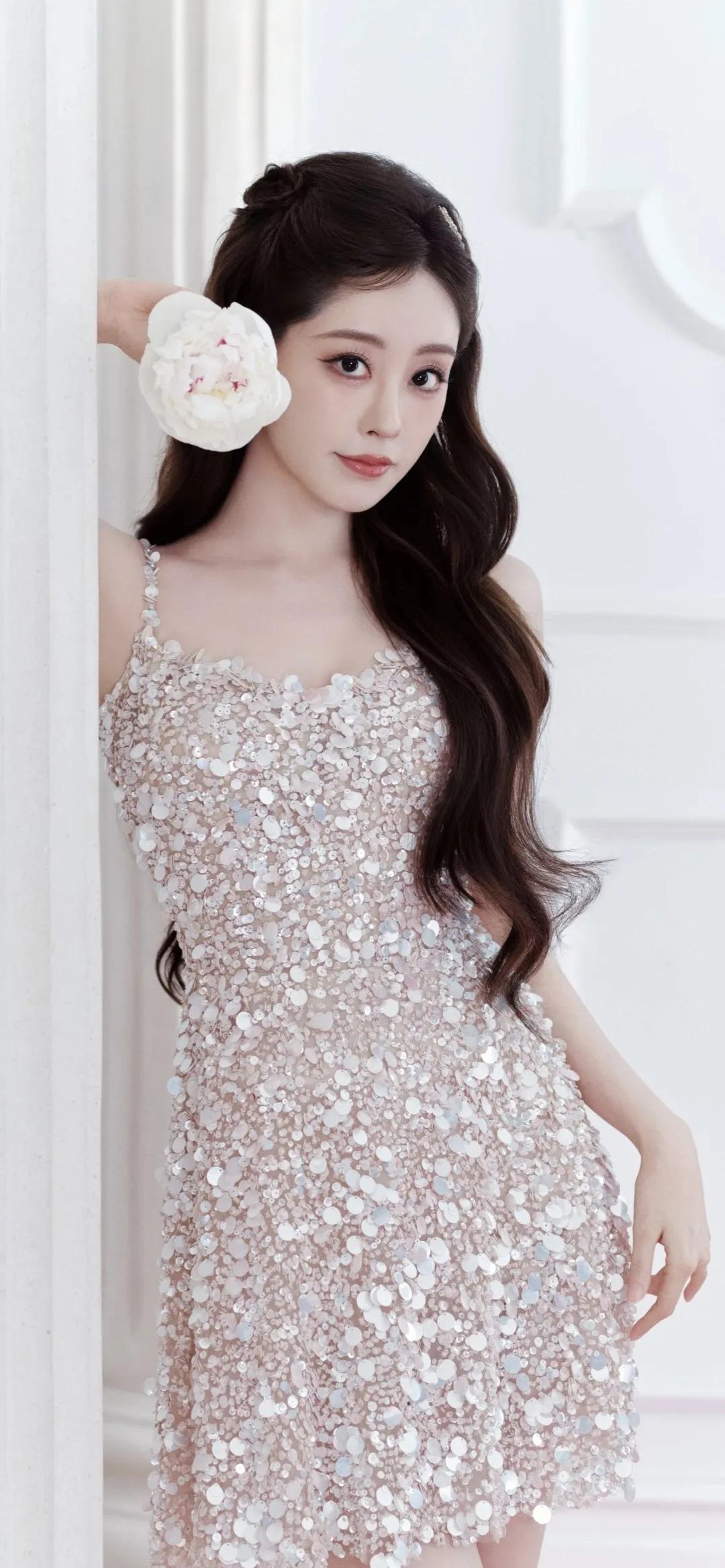 祝绪丹,粉色柔雾包裹的浪漫时刻 裸粉亮片裙缀满细碎星光,垂落的珍珠链与鬓边白花相
