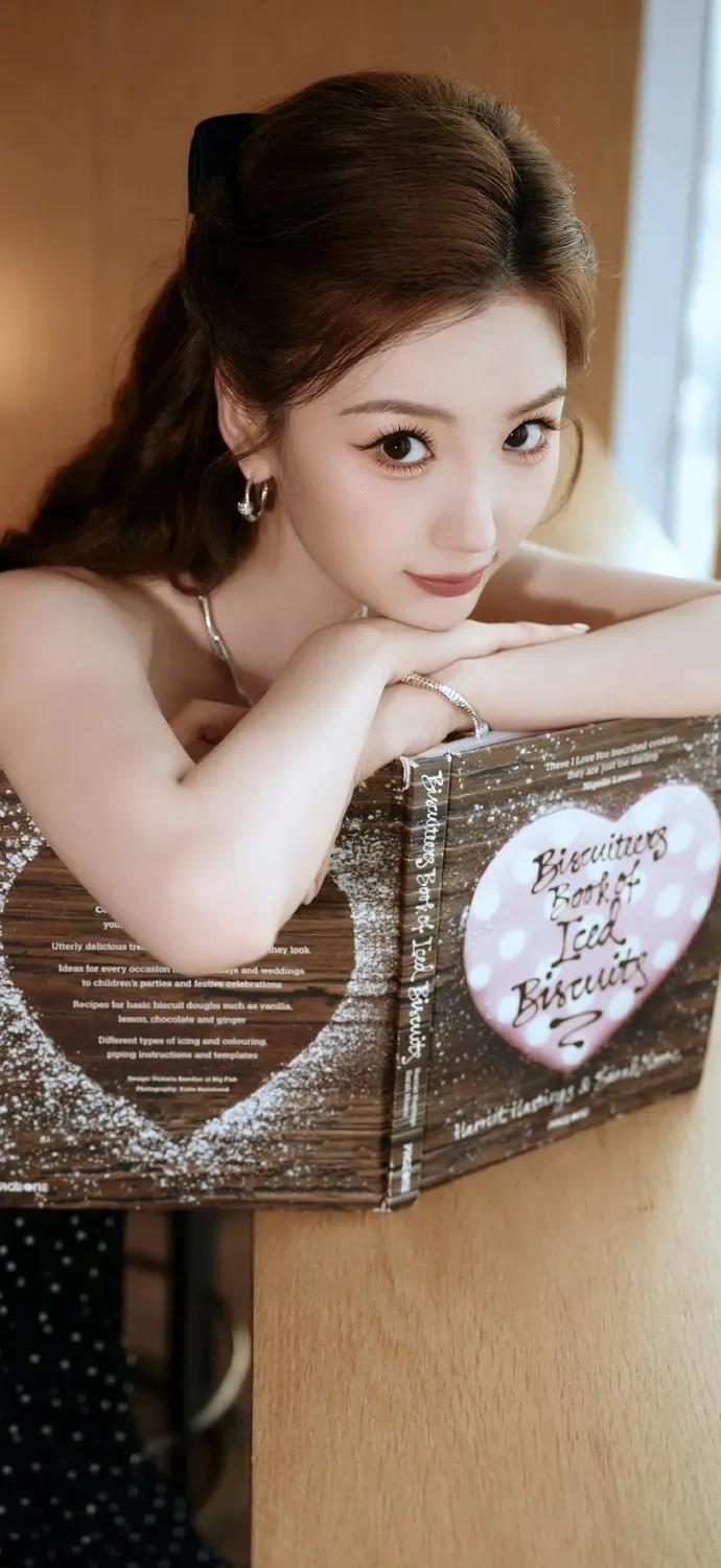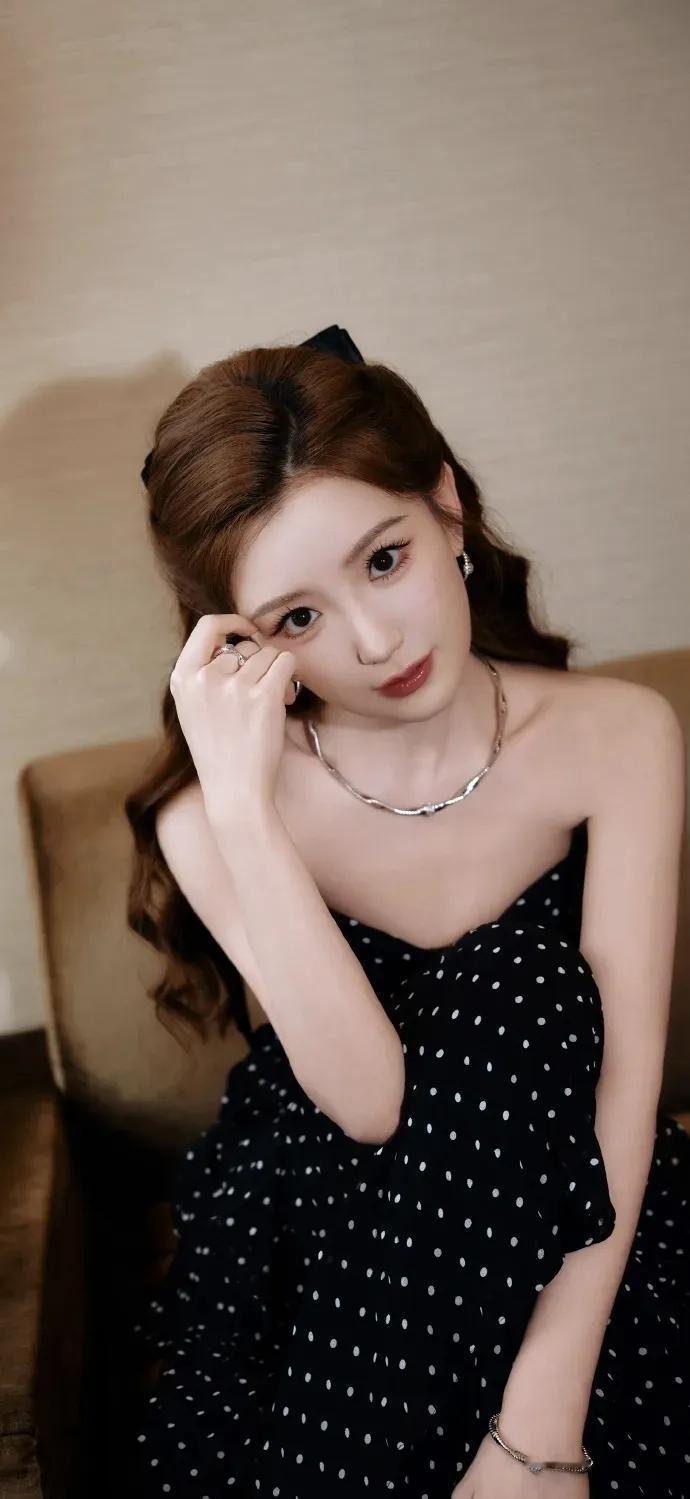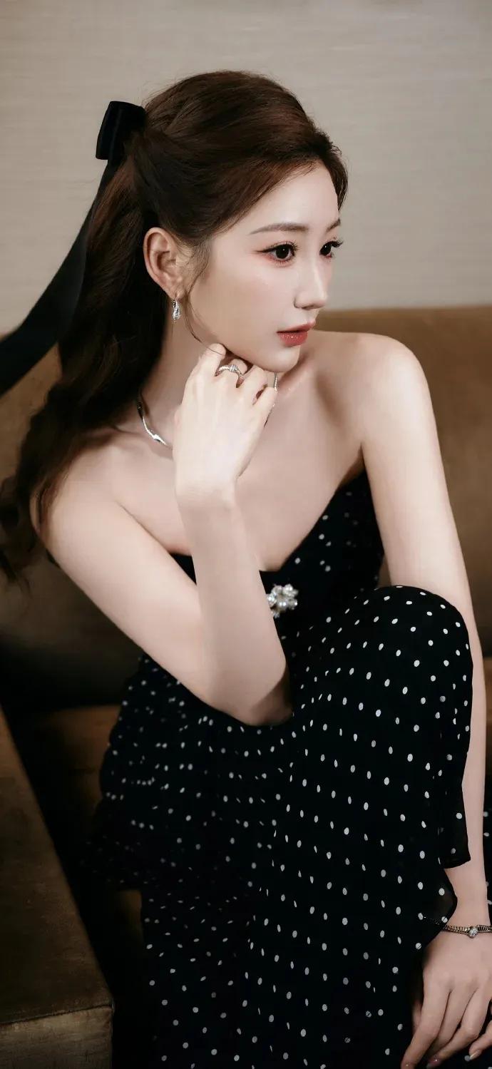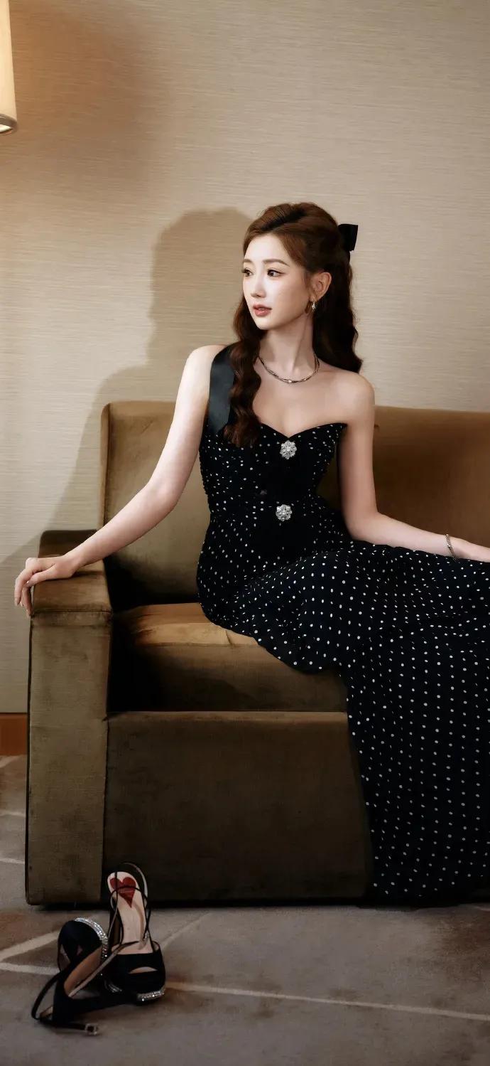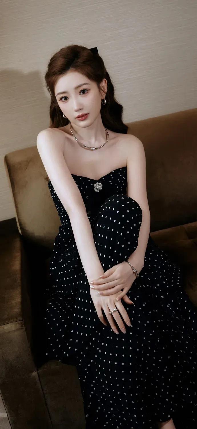 毛晓彤,复古黑底波点抹胸裙勾勒出曼妙身姿,缎面蝴蝶结为卷发添了几分灵动娇俏,细碎银饰点缀其间,暖调光影里晕开慵懒贵气